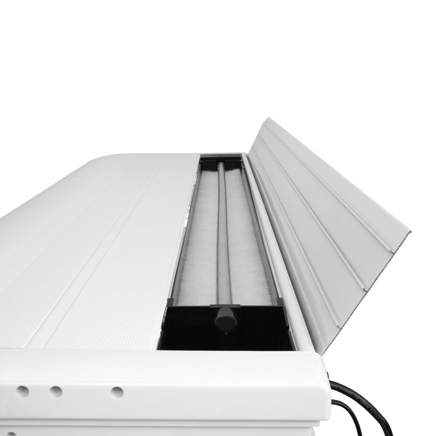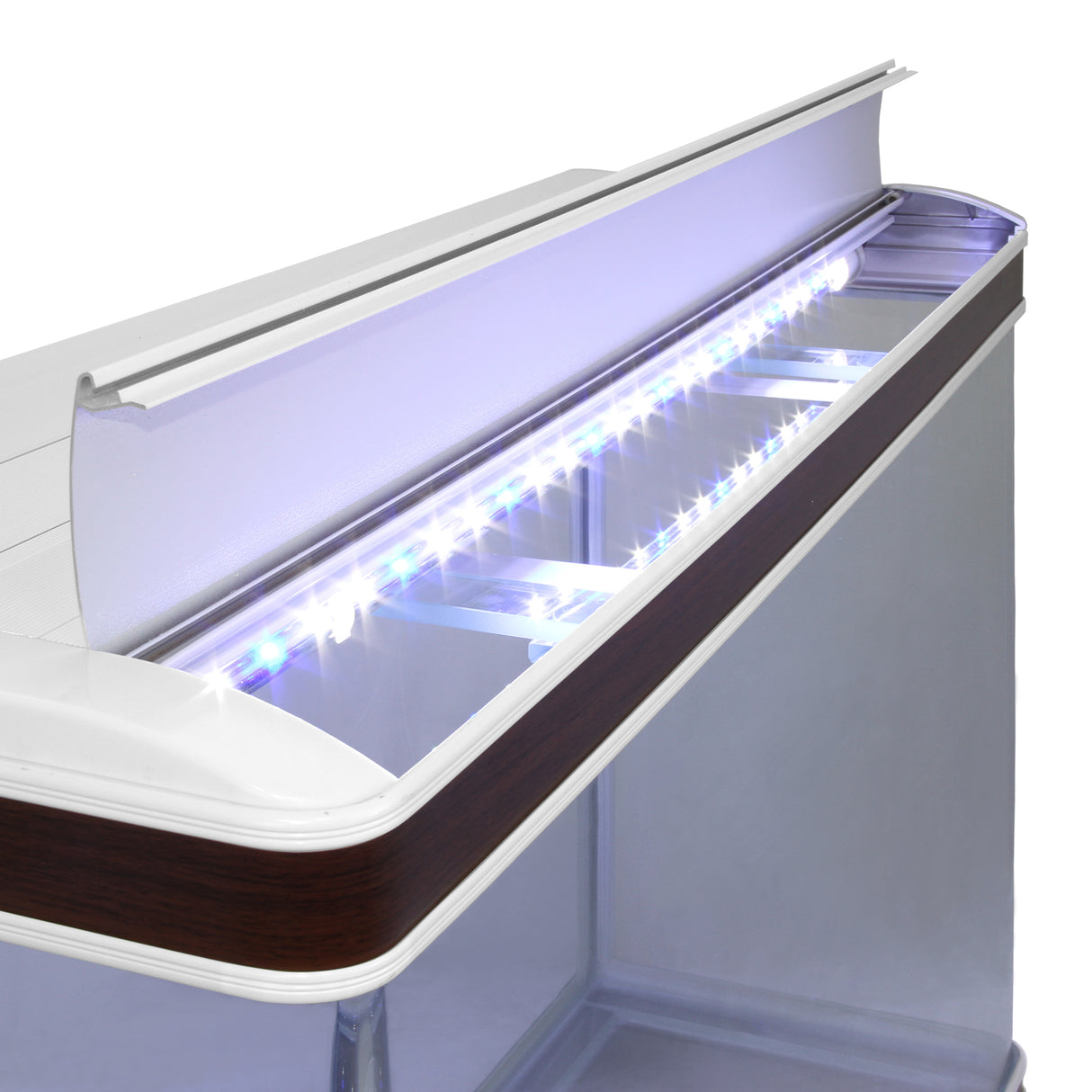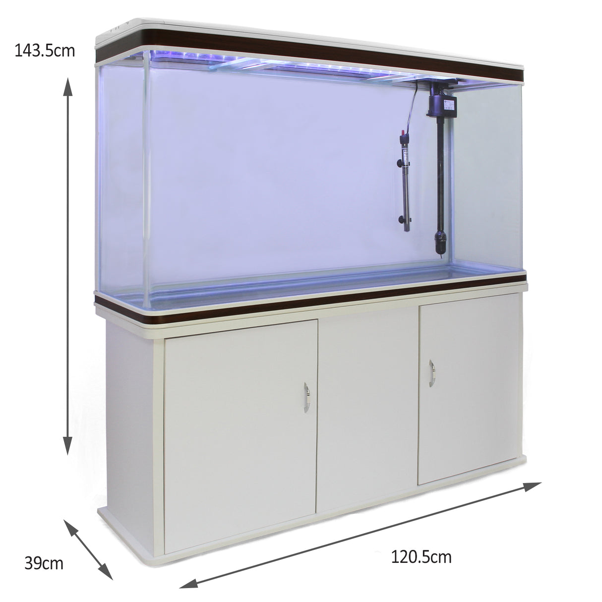Med måtten 120,5 cm x 39 cm x 143,5 cm (H x D x B) kan detta mångsidiga akvarium hysa färskvatten-, tropiska eller marina fiskar tack vare dess praktiska inbyggda filter, en luftpump och en avtagbar 300W värmare: alla väsentligheter när du monterar ditt akvarium. Utseendet fulländas med underbar LED-belysning i locket på tanken. Två LED-lampor ingår monterade och är justerbara för att passa din önskade belysning. Locket förser enkel åtkomst när du rengör ditt akvarium eller matar dina fiskar. Locket har också utrymme för slangar och kablar om det behövs.