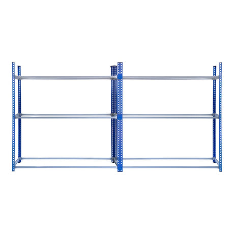 2 x T-RAX hyllenheter i blå metall 75 cm x 150 cm x 30 cm med gratis ihopkopplingsfästen