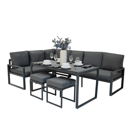 Designad för att kombinera stil och funktionalitet erbjuder detta sofistikerade set en bekväm och inbjudande sittplats – perfekt både för att ta emot gäster och för att koppla av i solen. Det inkluderar en rymlig hörnsoffa, två praktiska pallar och ett elegant bord med bordsskiva i härdat glas, vilket ger dig allt du behöver för att skapa ett funktionellt och stilfullt uterum.