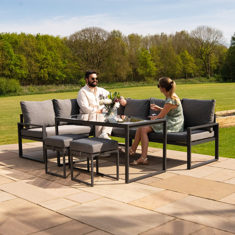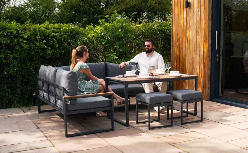 Genom att kombinera modern estetik med slitstarka material och praktiska detaljer är detta hörnsoffset i aluminium det perfekta komplementet till trädgårdar, terrasser eller uterum. Det inkluderar ett vattentätt överdrag som ger extra skydd och ser till att möblerna håller sig i toppskick året runt.