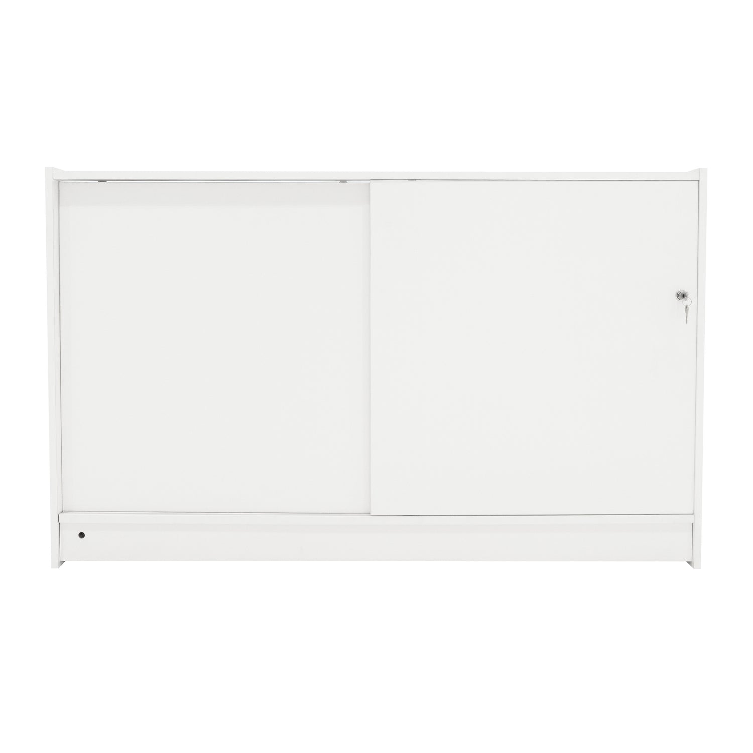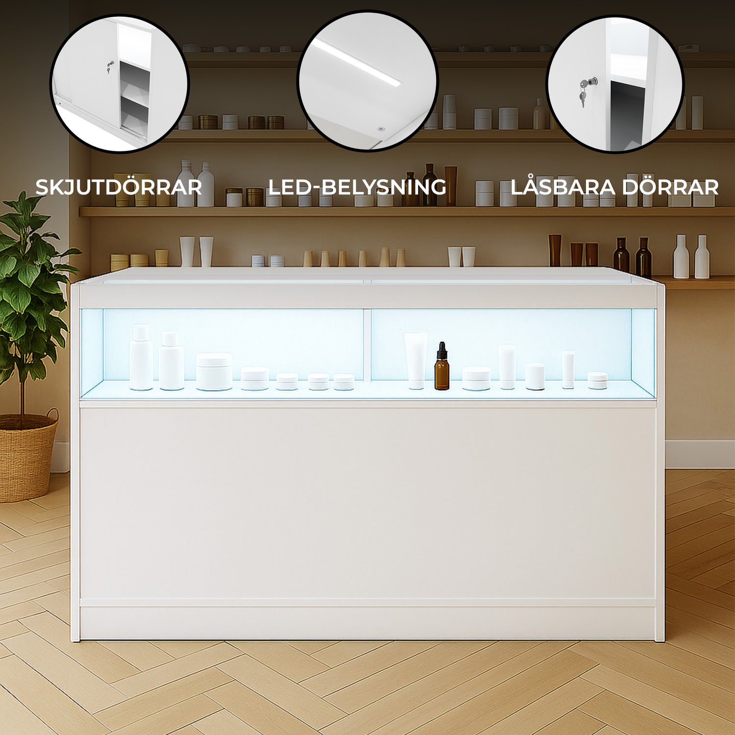 Disken balanserar smart mellan exponering och förvaring. Den har tre hyllor: en synlig genom den främre glaspanelen, idealisk för att visa upp utvalda produkter, samt två hyllor som är dolda bakom skjutdörrar med lås på baksidan. Två nycklar ingår för säker åtkomst, samtidigt som disken behåller ett rent och prydligt utseende från kundens perspektiv.