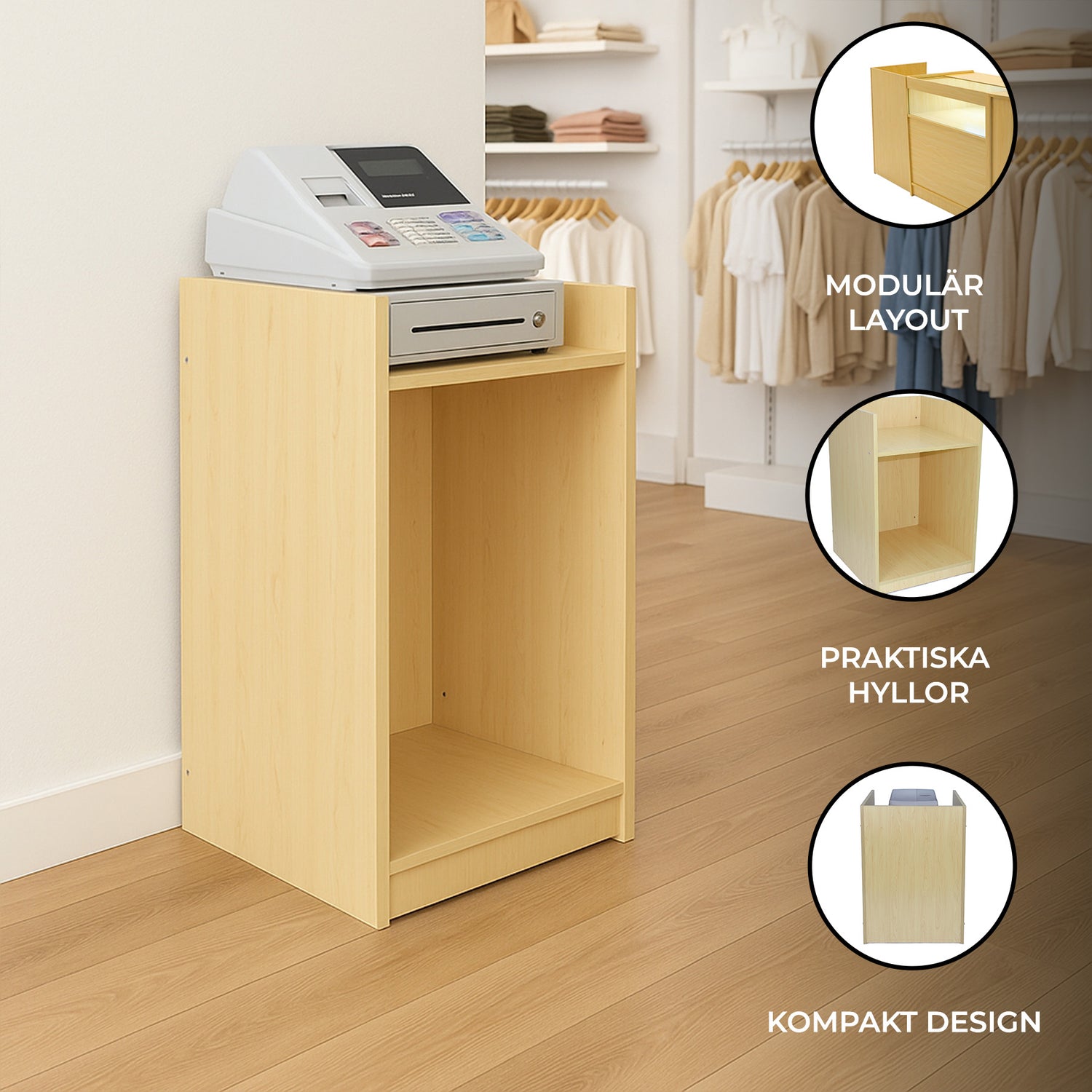 Den ergonomiskt inbyggda övre hyllan är utformad för att placera din kassaapparat och kortterminal på en bekväm höjd, vilket håller viktiga enheter säkra och lättillgängliga. Under finns ett rymligt förvaringsutrymme som ger plats åt allt från påsar, kassapappersrullar och presentpapper till personliga tillhörigheter. Du kan till och med placera en liten papperskorg diskret för att hålla området snyggt och fritt från skräp, vilket bidrar till ett rent och prydligt butiksklimat.