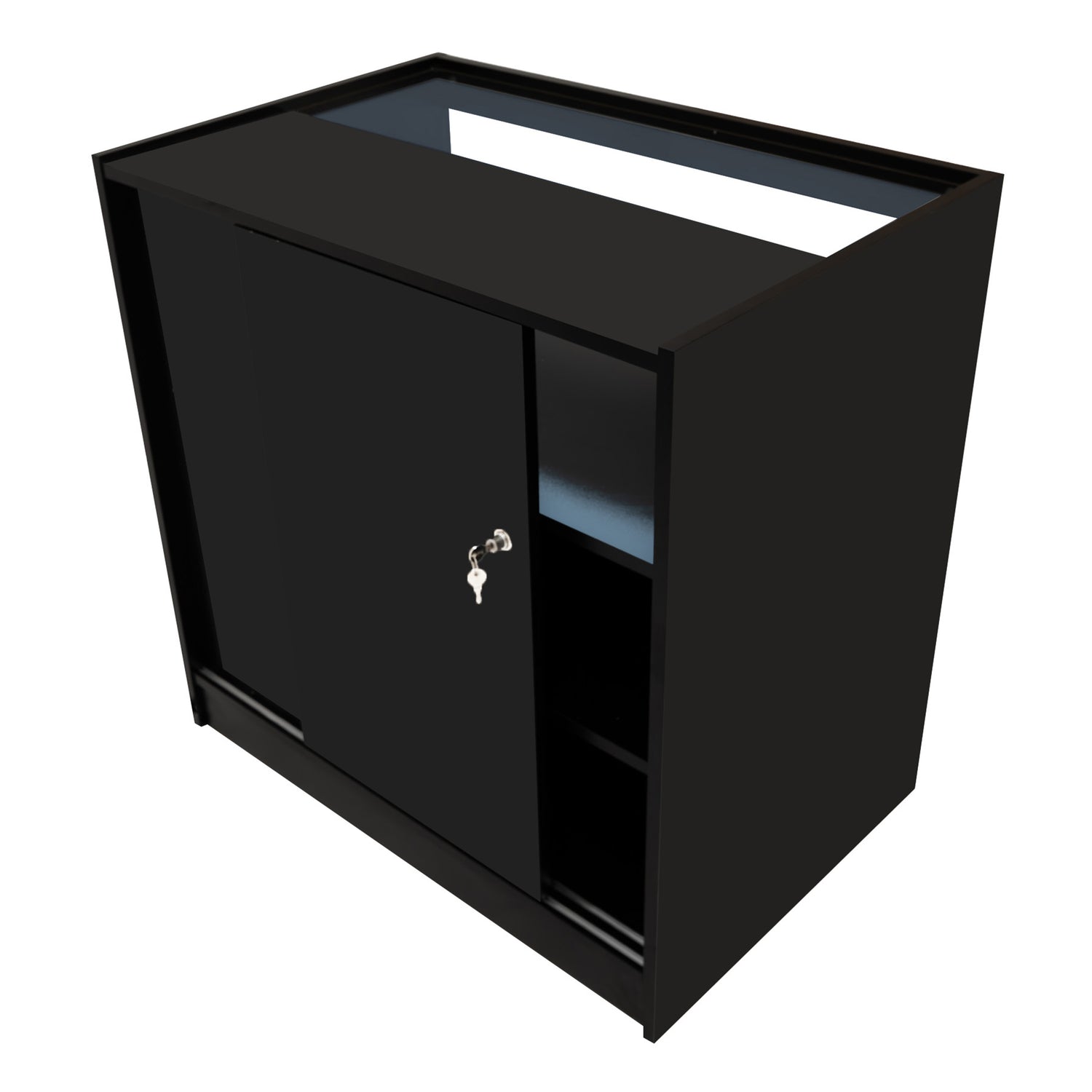 Med en exponeringshylla synlig genom den främre glasrutan och två hyllor dolda från kundens synfält, balanserar dessa diskar perfekt mellan säker förvaring och effektiv presentation. De bakre skjutdörrarna med lås håller lagret säkert samtidigt som disken bibehåller ett rent och professionellt intryck utåt.