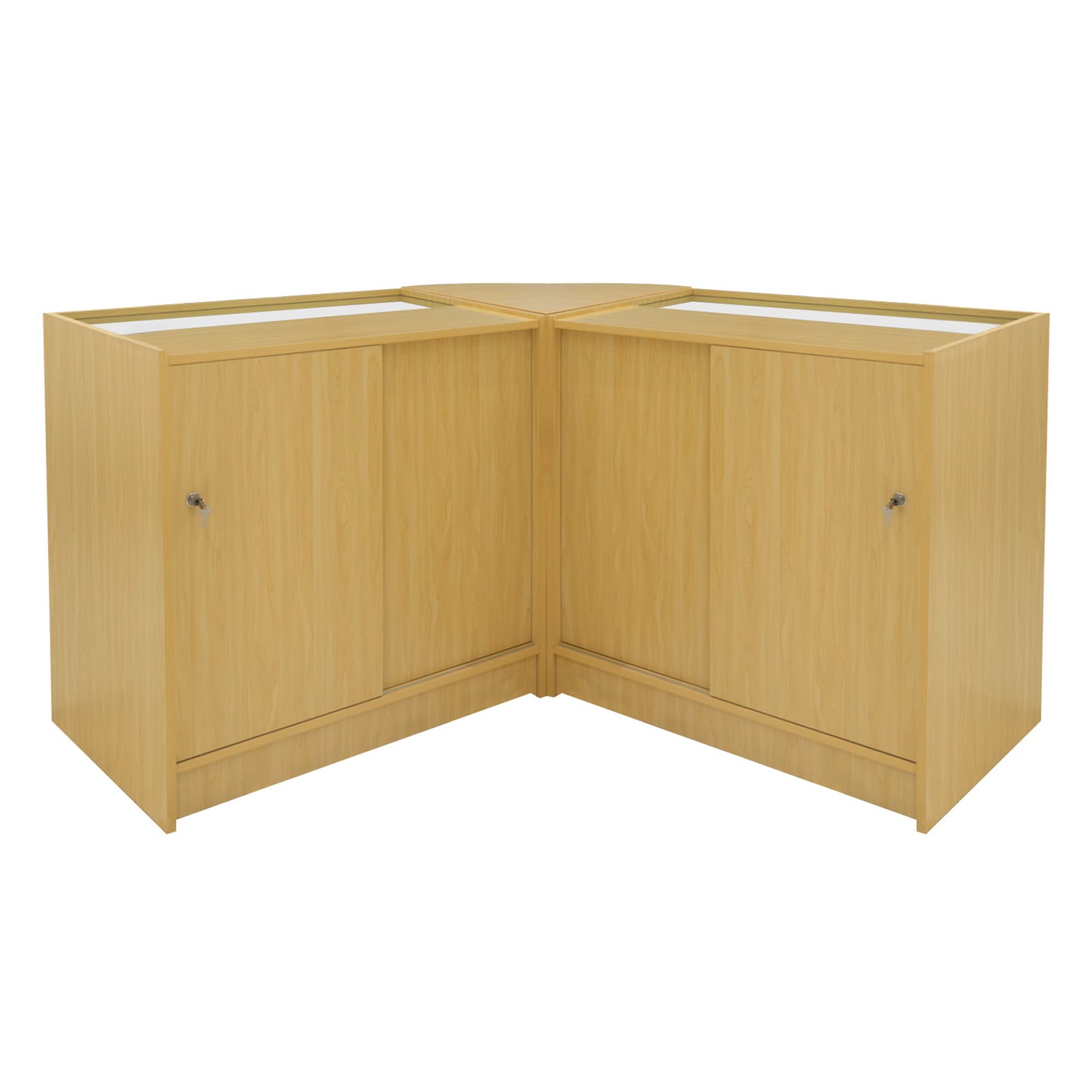 Det kurvade hörndisken CM60 erbjuder platsbesparande funktionalitet och bidrar till ett smidigt butikslayout. Med sin kompakta och rundade design passar den perfekt i hörn eller som länk mellan raka diskar, vilket skapar ett enhetligt och modulärt system. CM60 har en slät, stängd framsida som ger ett stilrent intryck, medan två dolda innerhyllor på baksidan erbjuder praktisk förvaring för lager eller tillbehör. Dessa hyllor är endast åtkomliga när enheten inte är placerad mellan andra diskar, vilket gör CM60 till en diskret och smart förvaringslösning som optimerar hörnutrymmen utan att kompromissa med estetik.