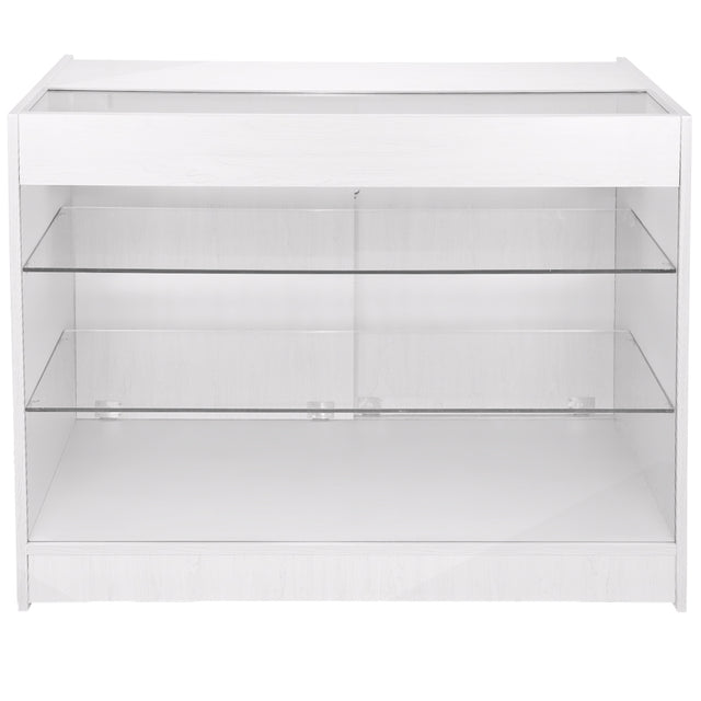 En modern modulenhet för butiker med glasruta på framsidan, halv glasruta på ovansidan och två uttagbara glashyllor på insidan. Skjutdörrarna på baksidan gör det lätt att komma åt och de går även att låsa.