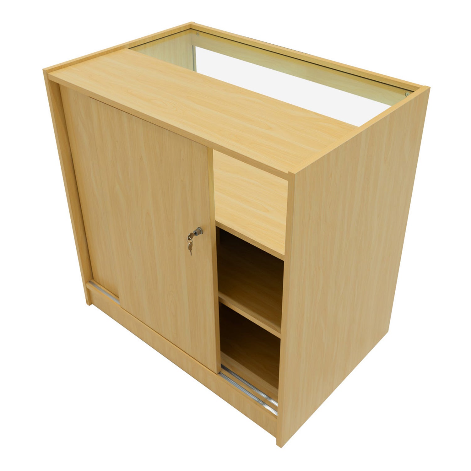 Med en exponeringshylla synlig genom den främre glasrutan och två hyllor dolda från kundens synfält, balanserar dessa diskar perfekt mellan säker förvaring och effektiv presentation. De bakre skjutdörrarna med lås håller lagret säkert samtidigt som disken bibehåller ett rent och professionellt intryck utåt.