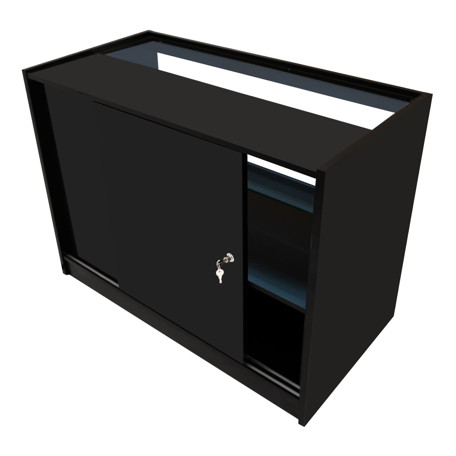Med en exponeringshylla synlig genom den främre glasrutan och två hyllor dolda från kundens synfält, balanserar dessa diskar perfekt mellan säker förvaring och effektiv presentation. De bakre skjutdörrarna med lås håller lagret säkert samtidigt som disken bibehåller ett rent och professionellt intryck utåt.