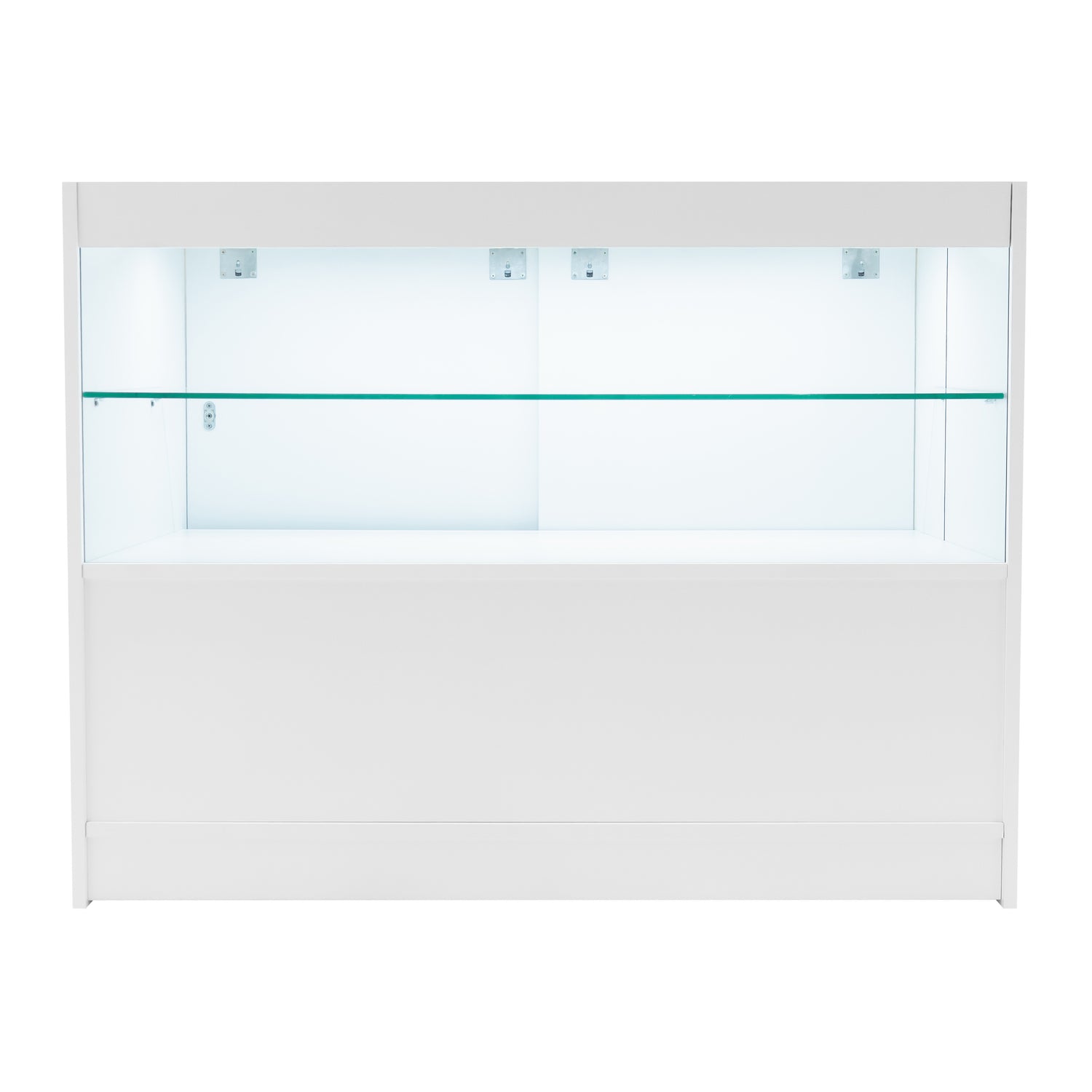 Med tre helt slutna exponeringshyllor bakom en front av härdat glas, skapar K900/K1200/K1500 en perfekt balans mellan produktvisning och säker förvaring. De låsbara skjutdörrarna på baksidan ger diskret åtkomst och bidrar till ett rent och professionellt intryck från kundens perspektiv.