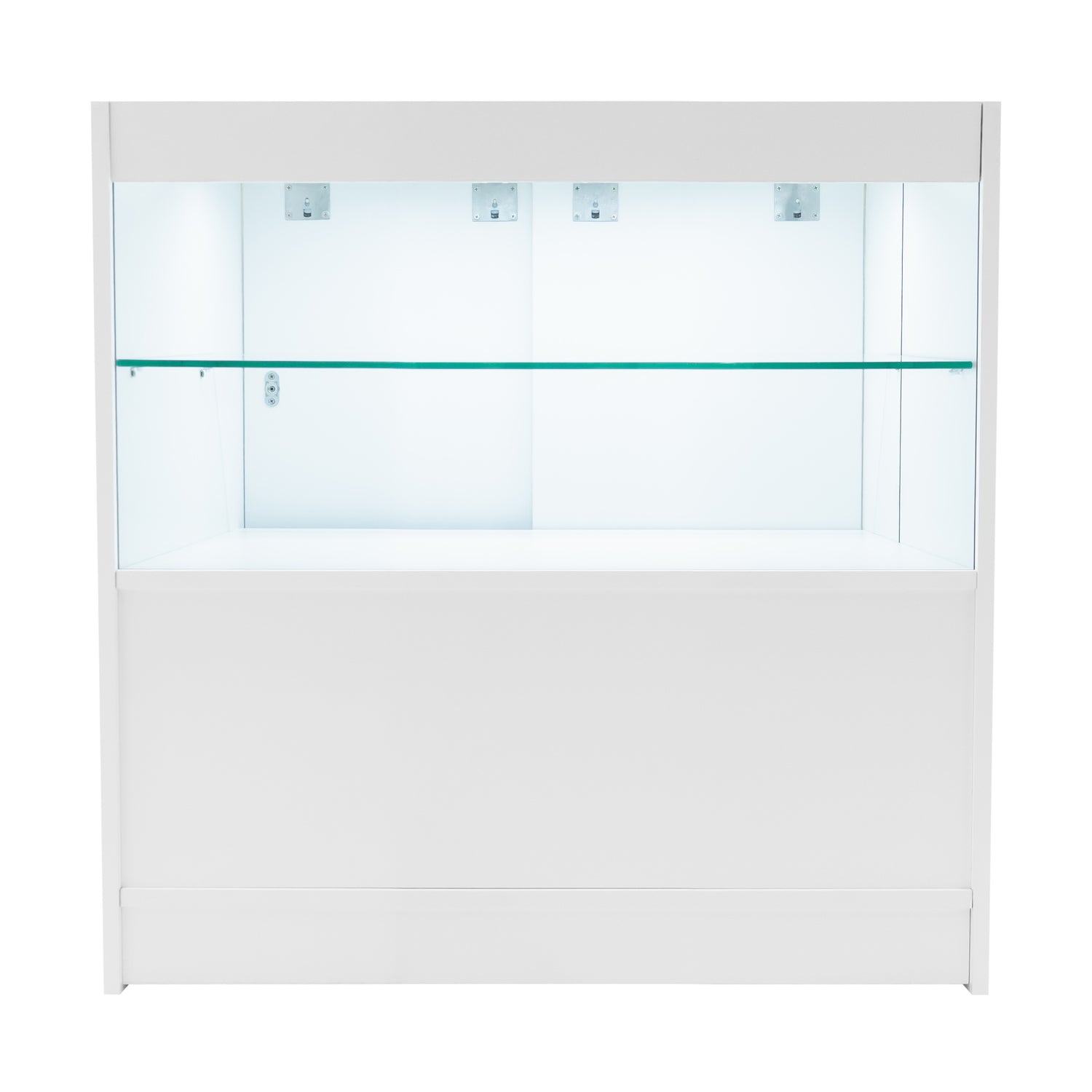 Med en exponeringshylla synlig genom den främre glasrutan och två hyllor dolda från kundens synfält, balanserar dessa diskar perfekt mellan säker förvaring och effektiv presentation. De bakre skjutdörrarna med lås håller lagret säkert samtidigt som disken bibehåller ett rent och professionellt intryck utåt.