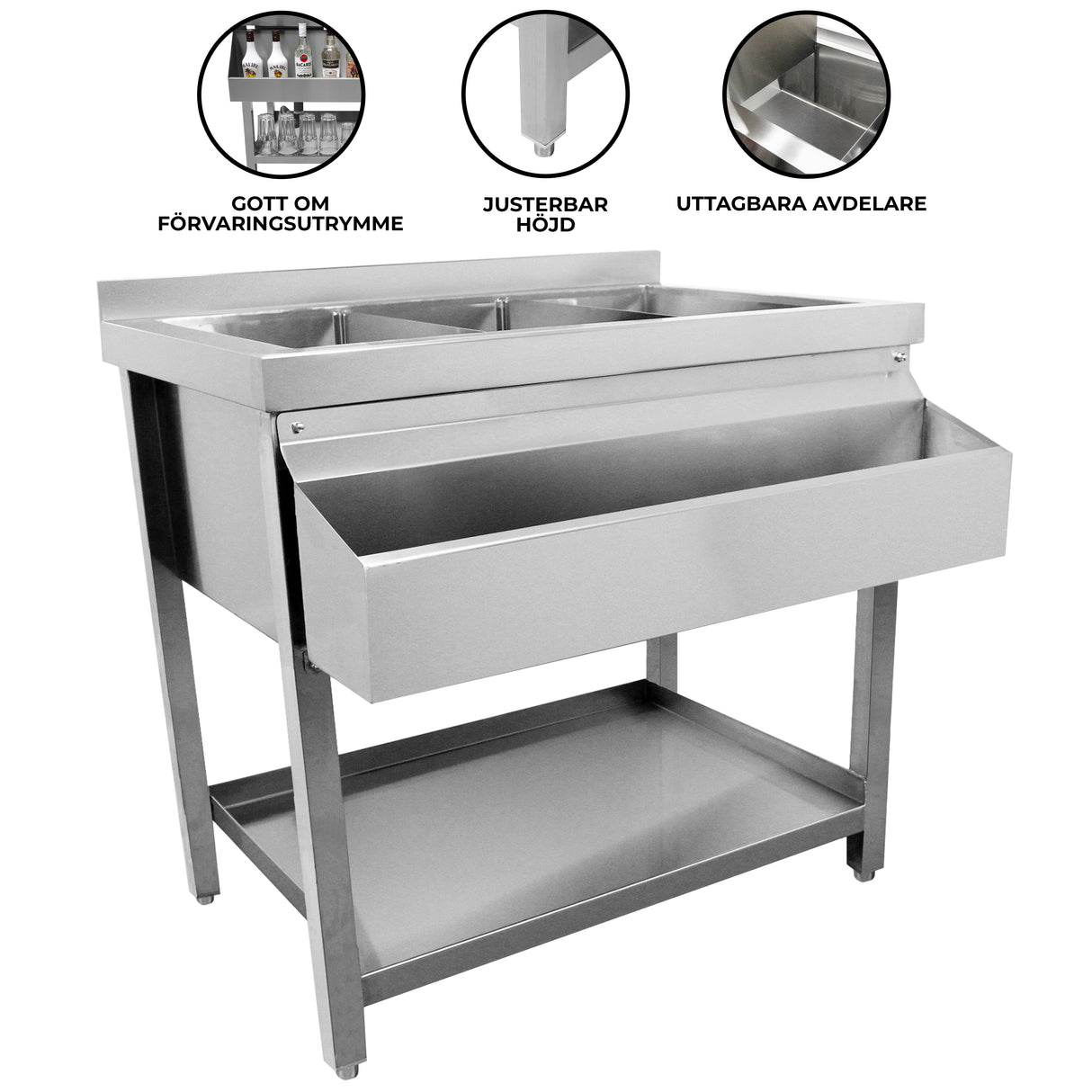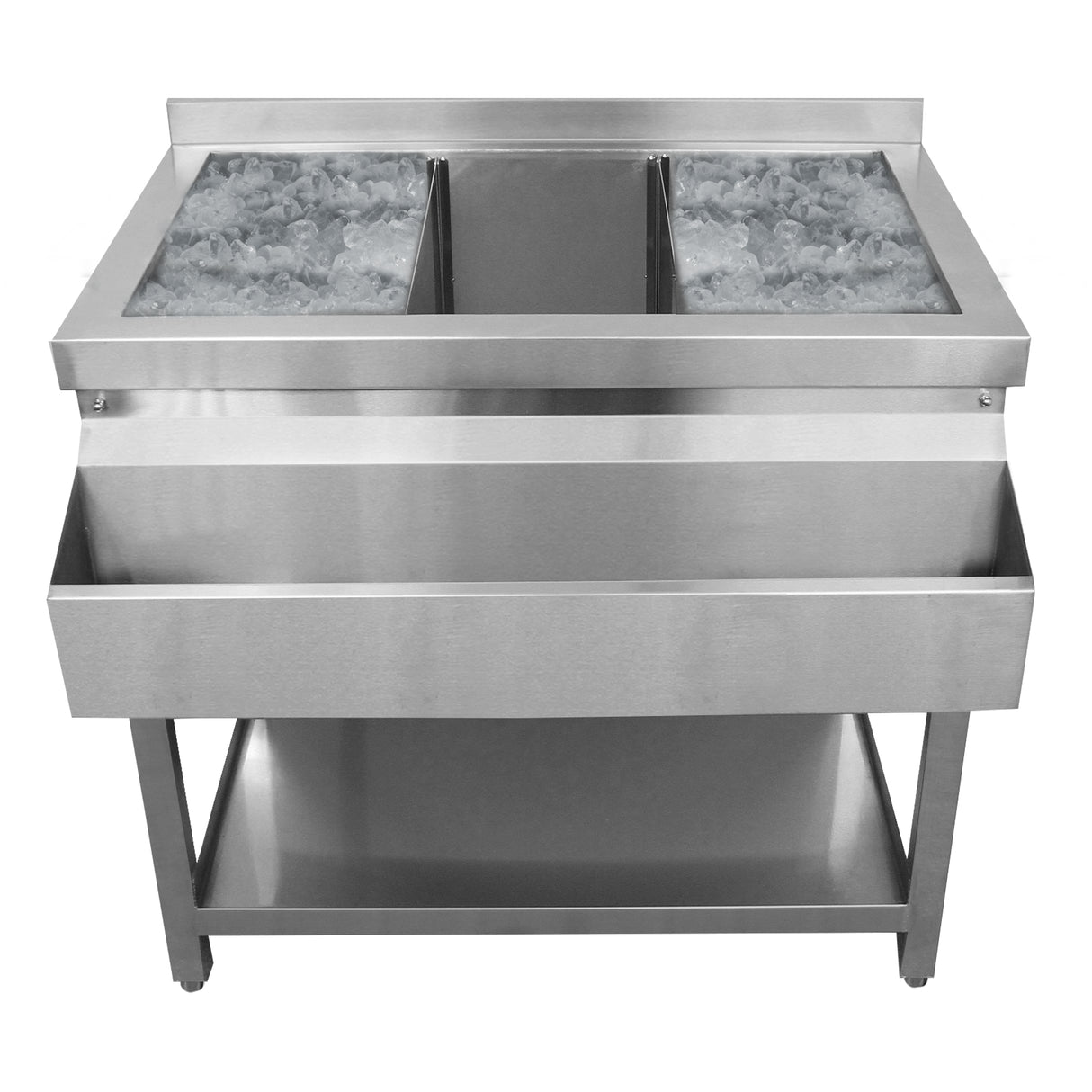 Barens arbetsstation har 3 isolerade isbrunnar, varav en inkluderar en dränering som kan användas som ett handfat. Du kan inte ha cocktails utan is och att ha isen till hands kommer säkerligen att göra din cocktailprocess mycket snabbare!