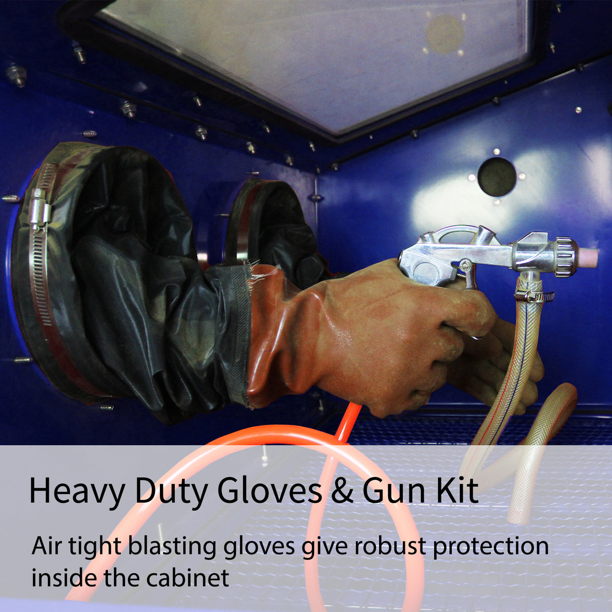 Blästern kommer med med en blästerpistol med 4 munstycken, kraftiga säkerhetshandskar, LED belysning och 5 stycken skyddsfilmer till glasrutan. Det enda ni behöver införskaffa inför användning är önskat blästermedel och en luftkompressor.