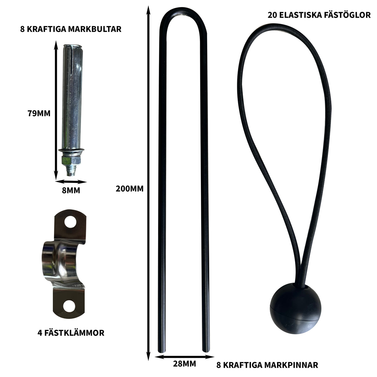 - 8 extra långa förankringsskruvar för hårt underlag