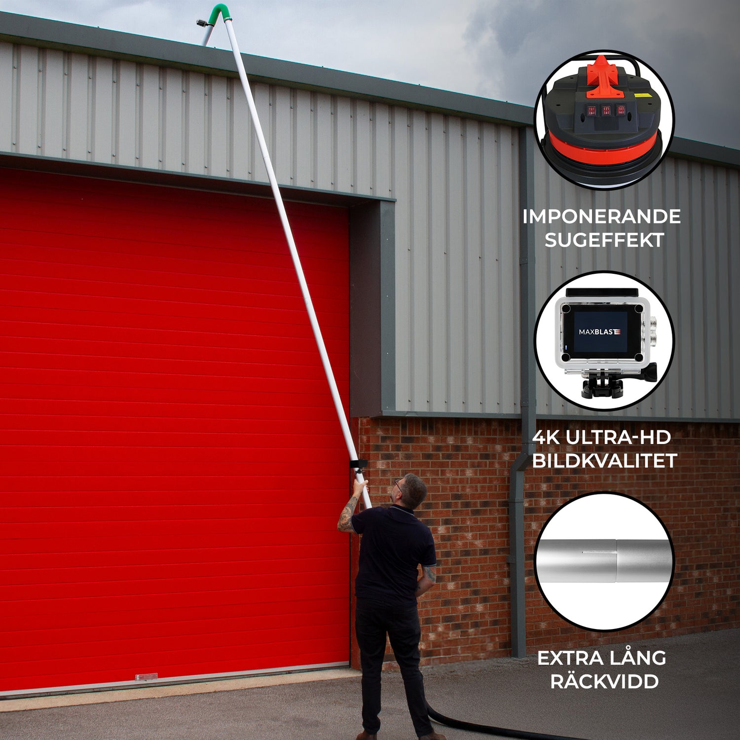 Designat för både proffs och privatpersoner, kombinerar detta kompletta system en högpresterande 90L våt- och torrdammsugare, ett system med förlängningsbara rör och en avancerad 4K-kamera, vilket ger dig räckvidd och synlighet för att rengöra hängrännor helt från marknivå.