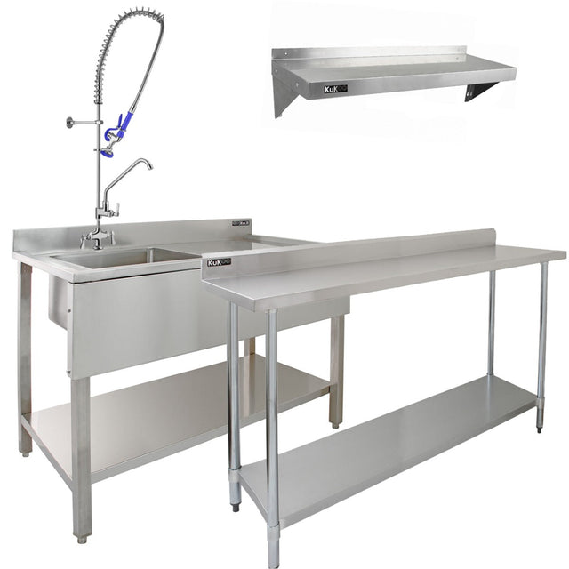 Starta upp ditt professionella kök eller komplettera din redan blomstrande verksamhet med detta fantastiska paket som innehåller en kommersiell diskho och förspolningskran, ett cateringbord, två väggmonterade hyllor samt en extra förspolningskran som grädde på moset.
