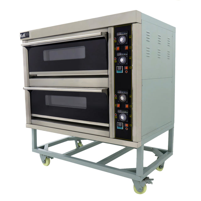 Enheten är fristående och portabel på sina fyra robusta hjul. Denna generöst tilltagna, kommersiella, ugn har två plan som styrs separat och kan rymma upp till 12 x 10 tums pizzor totalt.