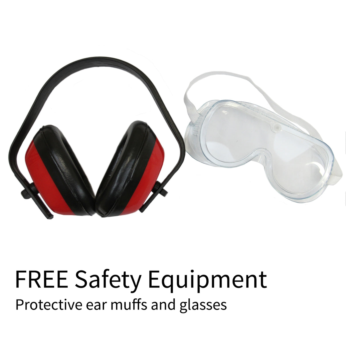 • Gratis CE-certifierad säkerhetsutrustning (PPE) - ögonskydd, handskar och hörselkåpor. Vänligen använd dessa medan maskinen är i användning.