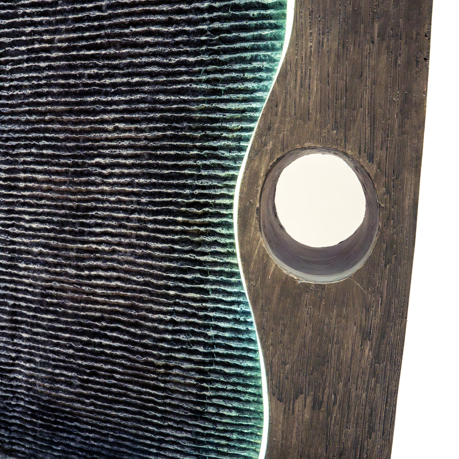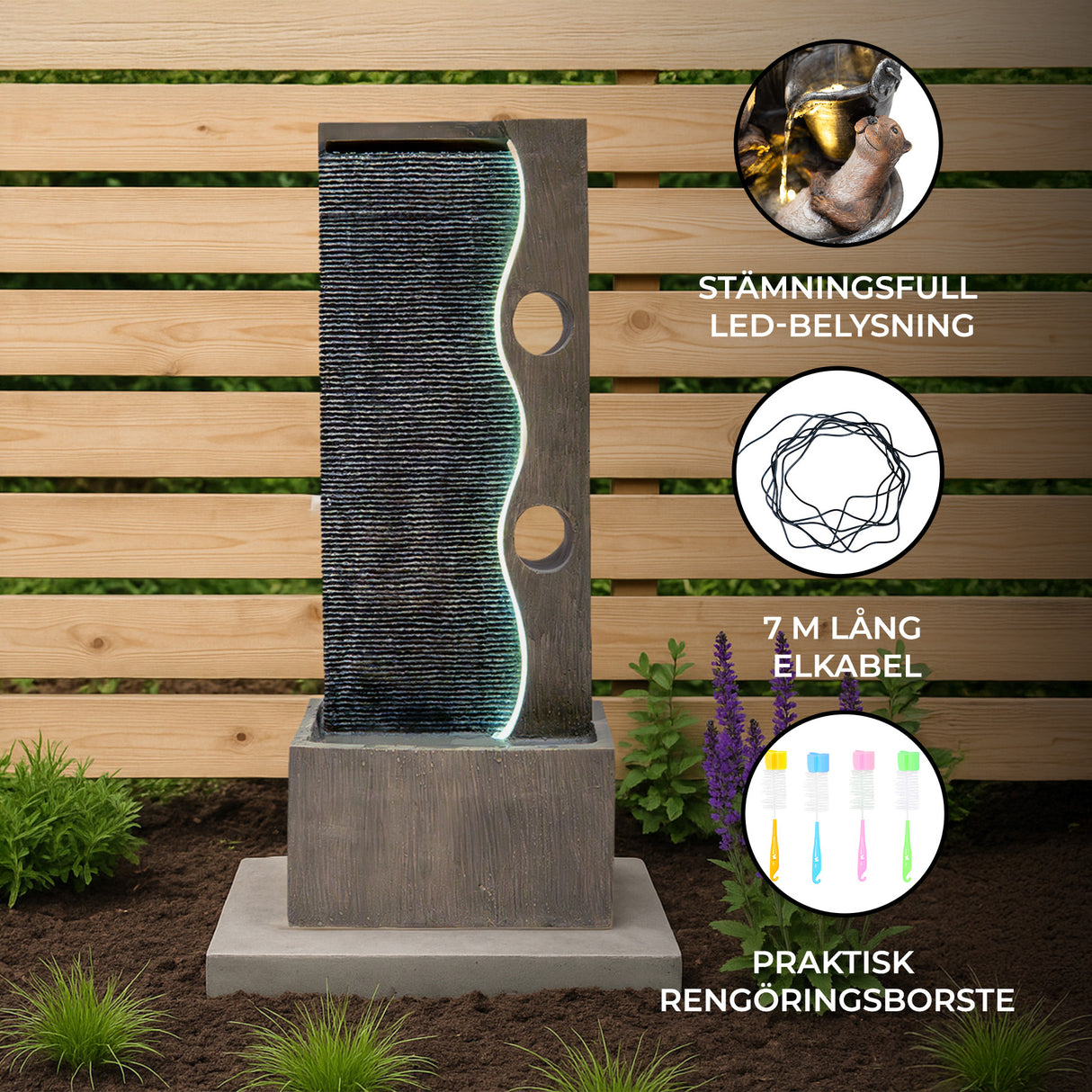 Tillverkad av hållbar och väderbeständig polyresin, är "Harmony Falls" byggd för att stå emot elementen samtidigt som den behåller en yta som efterliknar natursten. Vattnet rinner mjukt nerför den räfflade centrala panelen och skapar ett fint och rogivande ljud som inbjuder till lugn. Den släta vertikala ytan kontrasterar mot de rena arkitektoniska linjerna och de cirkulära utskärningarna, vilket ger en konstnärlig touch som lätt smälter in i moderna eller minimalistiska trädgårdar.
