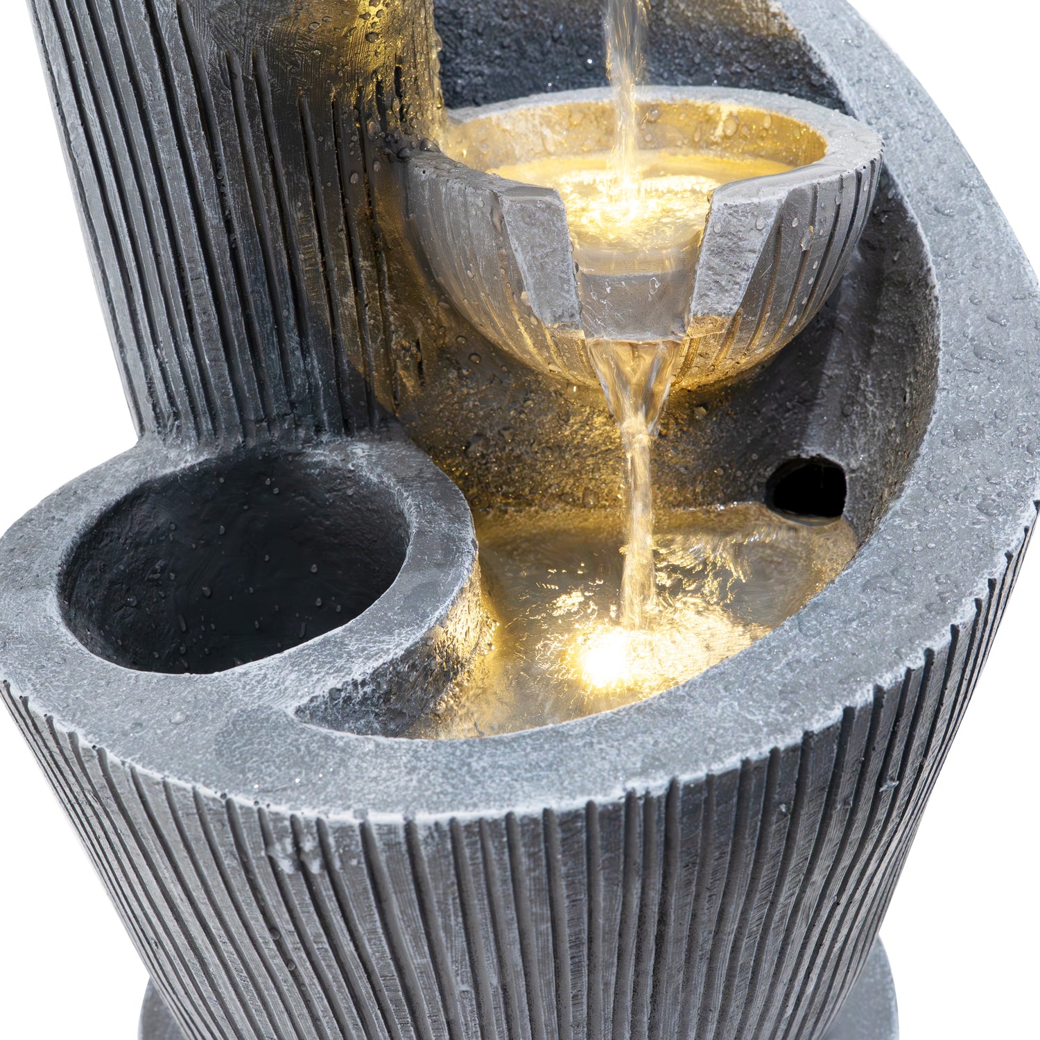 Varmvita LED-lampor lyser försiktigt upp det forsande vattnet och skapar ett lugnt sken när kvällen faller. Oavsett om du njuter av dagsljusets atmosfär eller kvällsatmosfären, ger denna fontän en touch av elegans till varje utomhusögonblick.