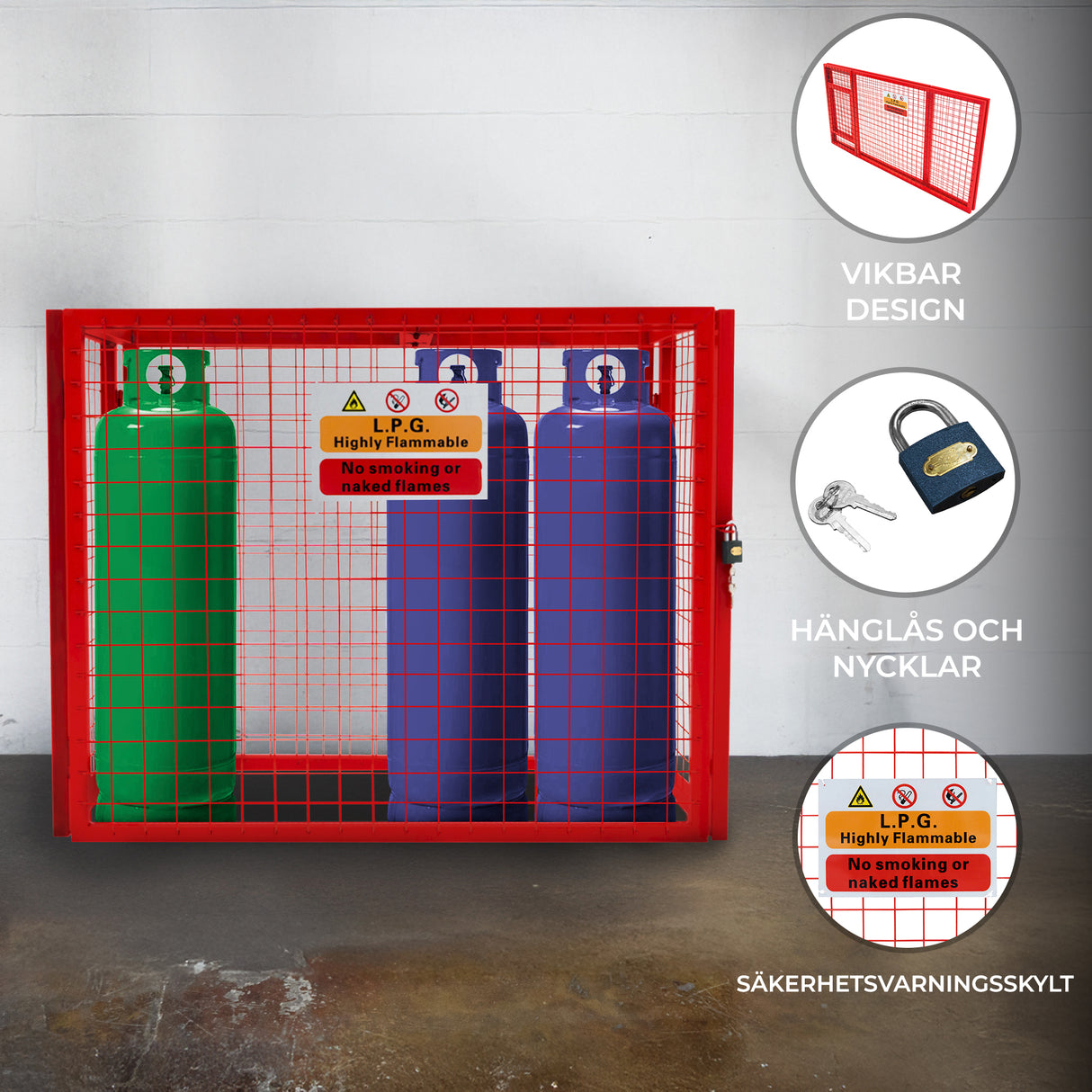 Buren rymmer upp till tre standardgasflaskor på 19 kg och optimerar utrymmet utan att kompromissa med kompaktheten. Säkerheten är en prioritet, och buren är utrustad med två robusta hänglås med två nycklar vardera samt två kedjor för att skydda gascylindrarna från obehörig åtkomst. Dessutom förstärker en tydligt synlig varningsskylt de nödvändiga säkerhetsåtgärderna.