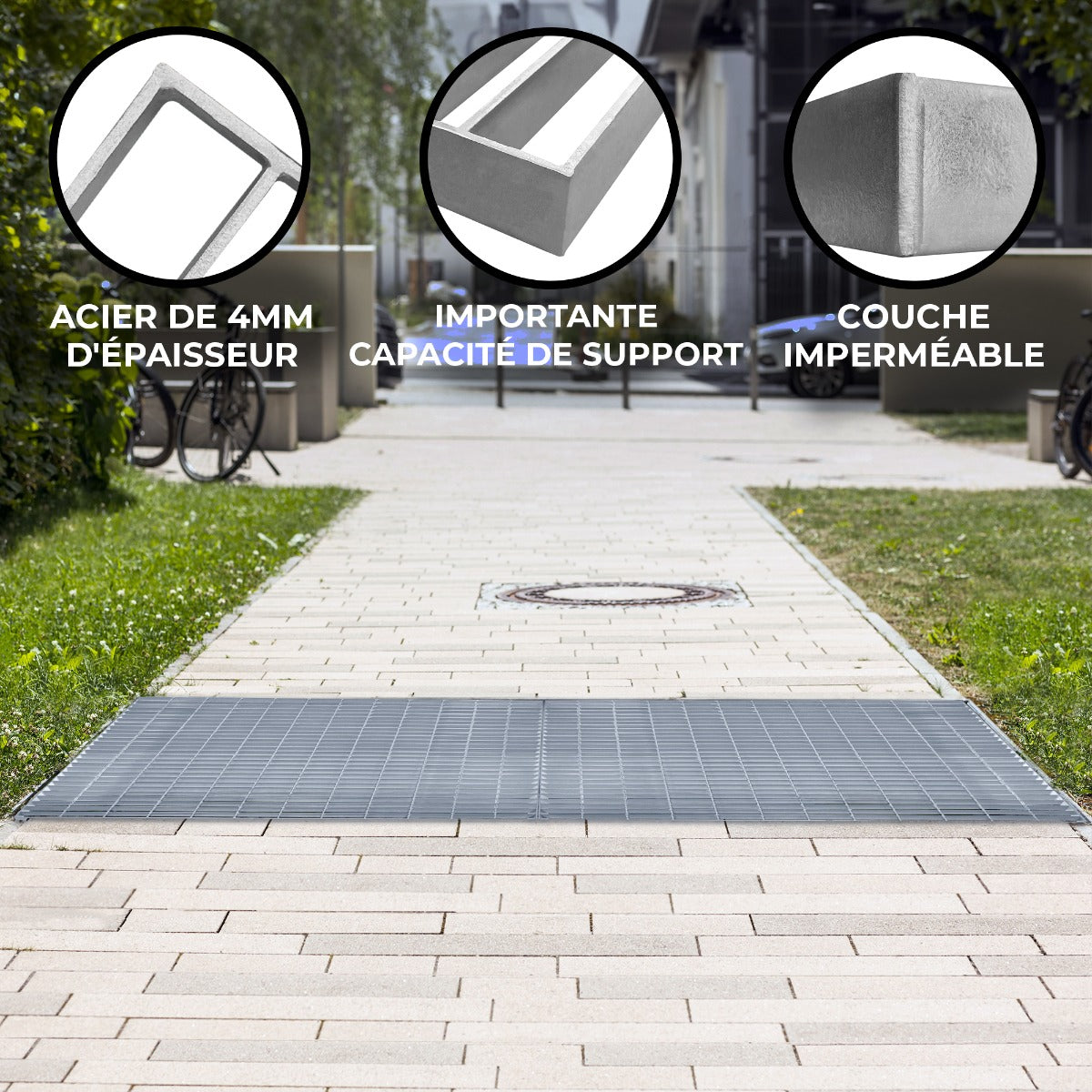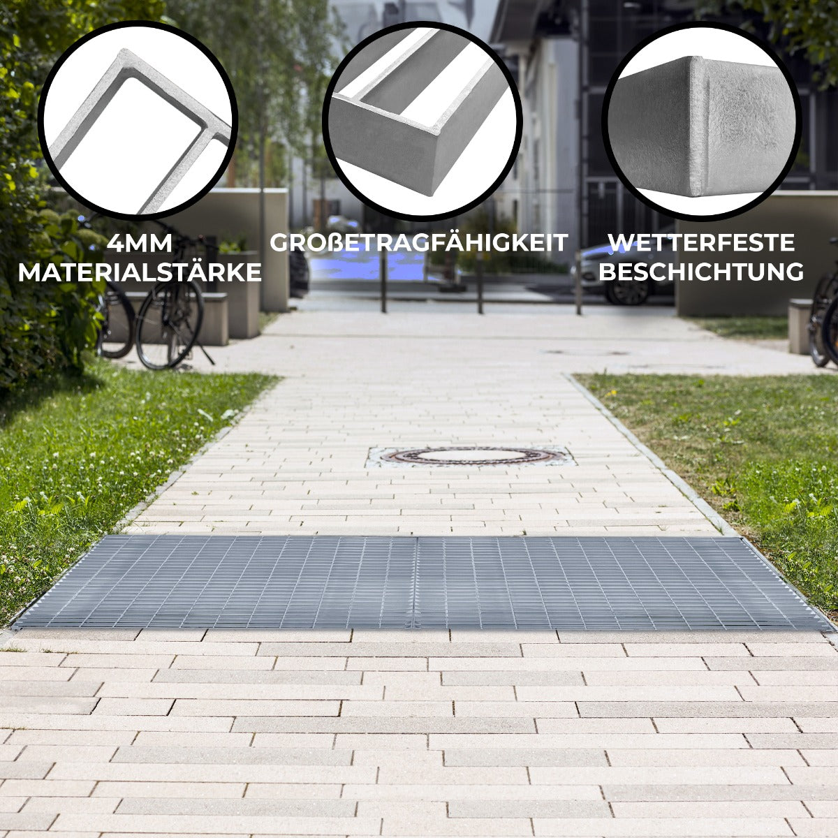 Tillverkad av högkvalitativt varmförzinkat stål erbjuder detta galler exceptionellt motstånd mot korrosion, vilket gör det lämpligt för både inomhus- och utomhusbruk. Det tål också hårda väderförhållanden, vilket garanterar pålitlig prestanda och lång livslängd. Tack vare sin 4 mm tjocka metallstruktur och imponerande belastningskapacitet på 1200 kg ger denna smidda gångväg överlägsen stabilitet och hållbarhet.