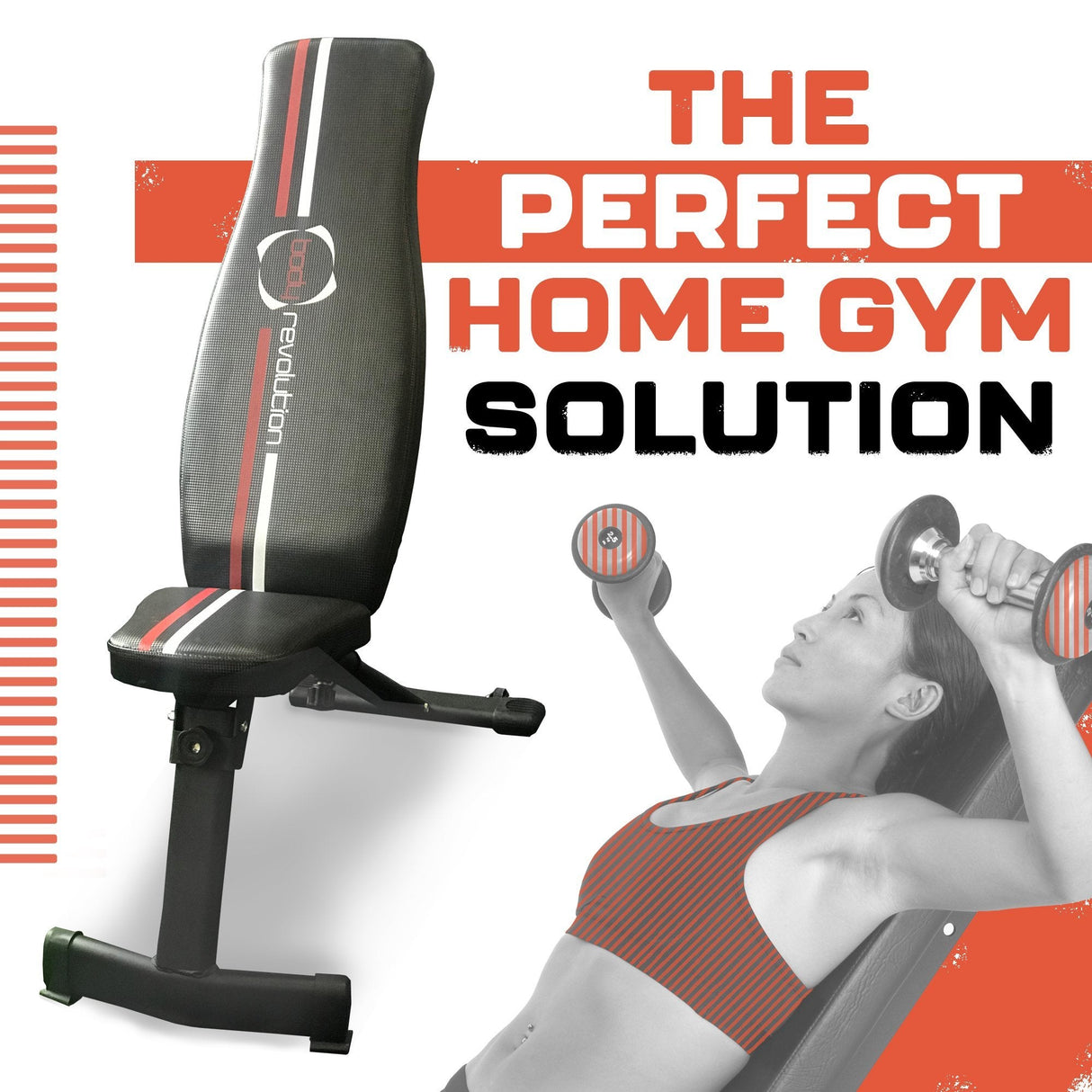 Body Revolution träningsbänk är fullt justerbar för mångsidiga hemmaträningar, den perfekta gymutrustningen för hemmet.