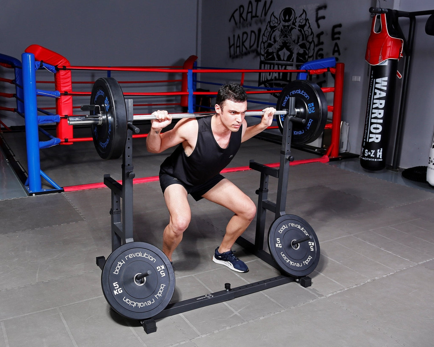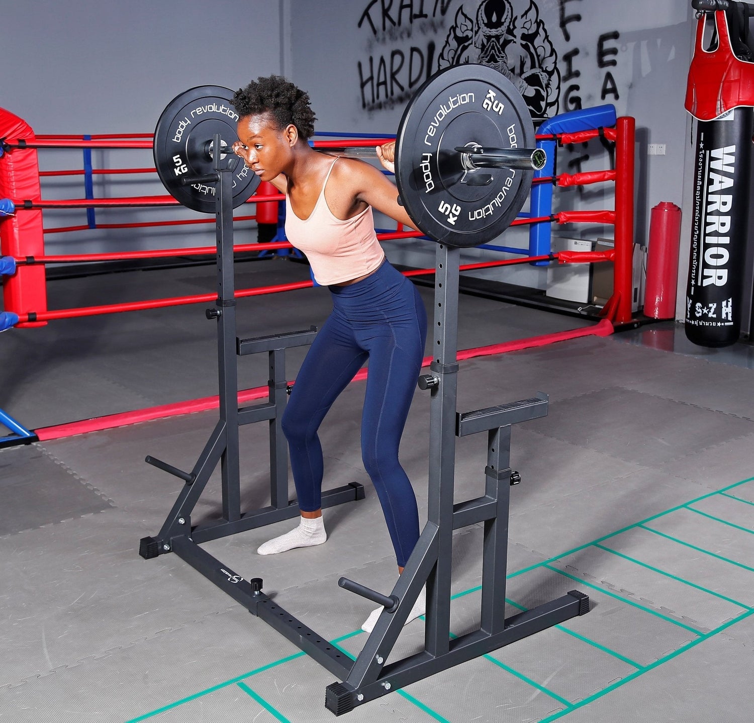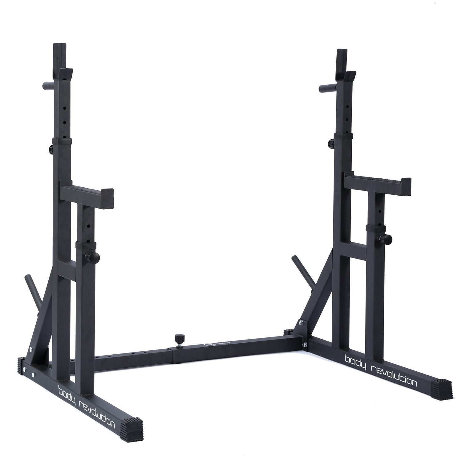 • Knäböjsställning med justerbar design från Body Revolution. Denna mångsidiga hemmaträningsutrustning är den ultimata tillägget till vilket gym som helst, perfekt för alla olympiska skivstångsövningar.