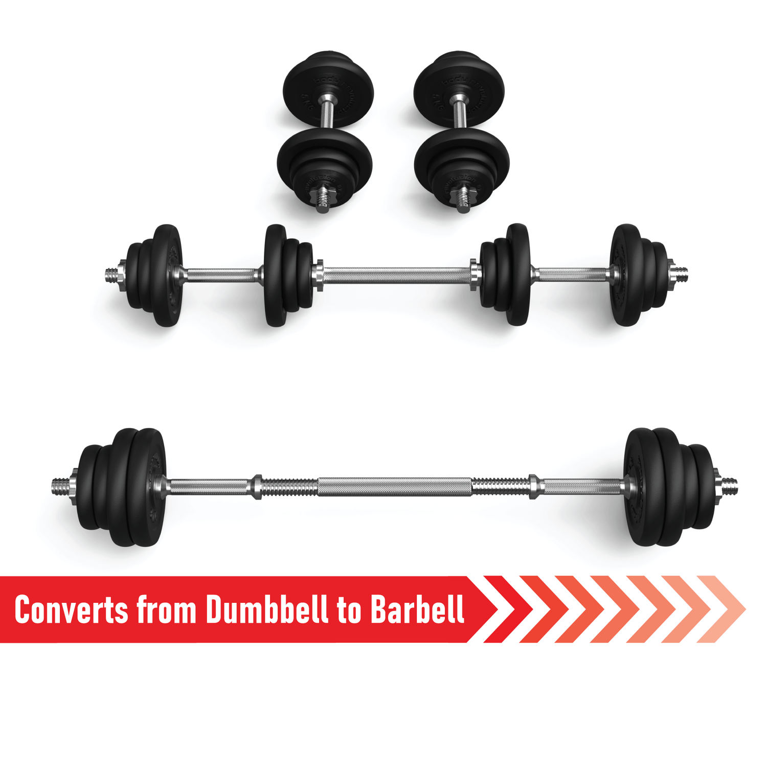 • 2-I-1 SKIVSTÅNGSLÄNK - Detta dynamiska och mångsidiga set är den perfekta personliga träningskamraten. Konverteras snabbt och enkelt från hantlar till skivstång på några minuter. Utbudet av övningar du kan utföra är oändligt - från knäböj och marklyft till pressar och curls