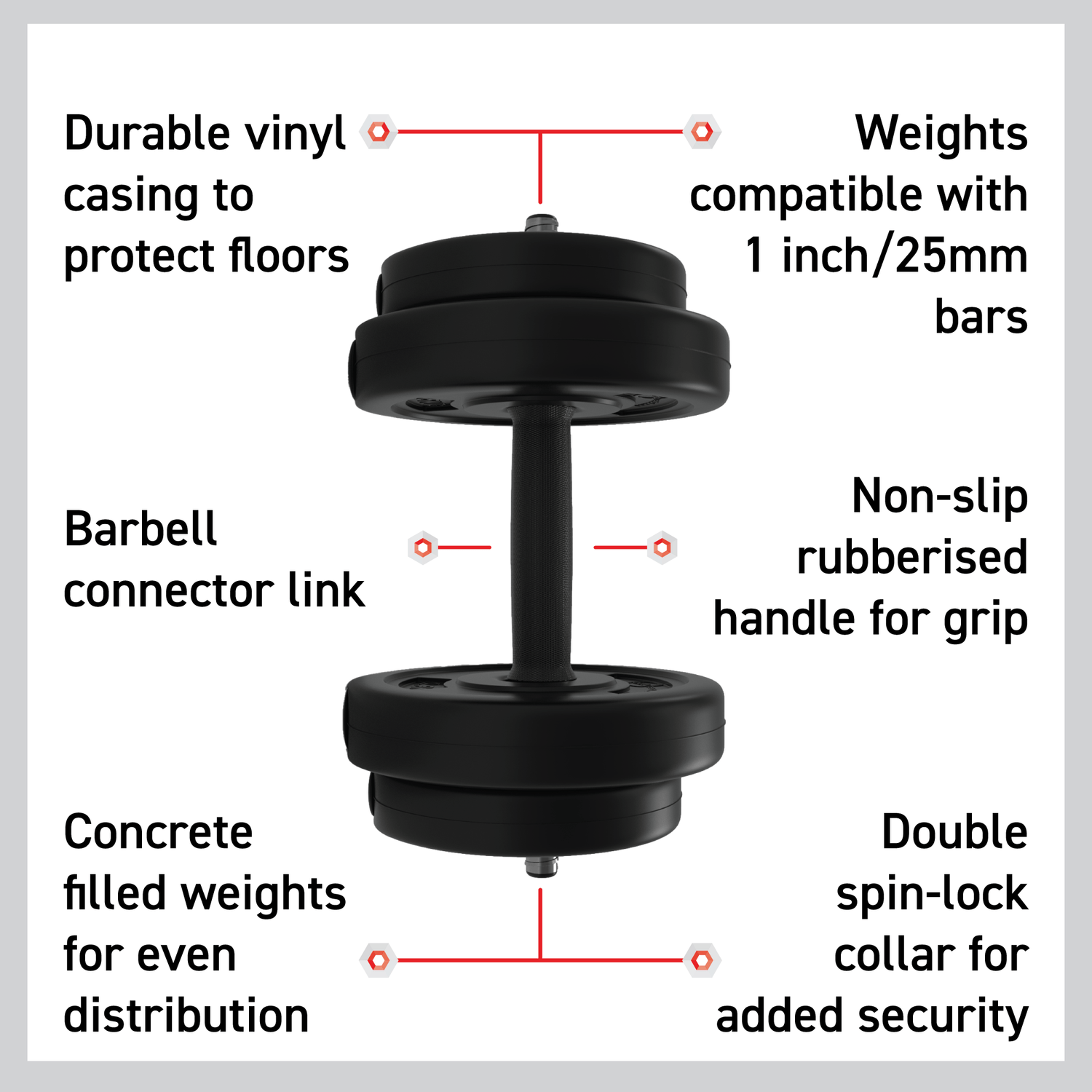 • JUSTERBARA HANTLAR - Setet inkluderar hantlar, viktskivor och en skivstångslänk. Det är nödvändig utrustning för fitnessträning eftersom det är mångfunktionellt och det mjuka vinylöverdraget är utformat för att skydda golvet vid hemmaträning