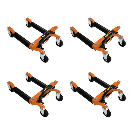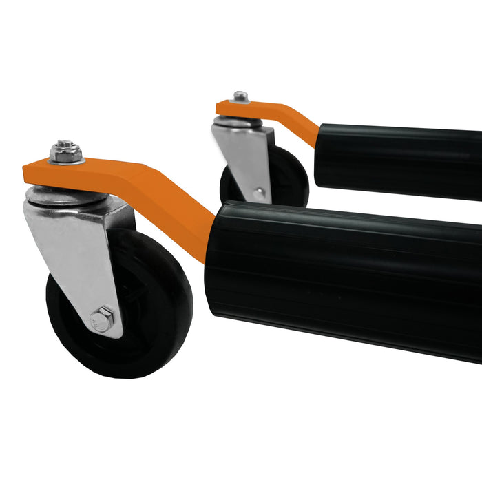 Varje vagn är utrustad med fyra hjul på 9,5 cm (3 ¾") som möjliggör mjuk och rundgående rörelse, och de klarar fordon med hjul upp till 10" i bredd. När de är stängda mäter vagnarna 37,5 cm i bredd, men när de är öppna sträcker sig bredden mellan rullarna till imponerande 58,2 cm, vilket ger en total expanderad bredd på 82 cm, vilket gör dem lämpliga för en mängd olika fordon. Dessutom säkerställer de robusta och stora rullarna stabil kontakt med lasten, vilket förbättrar hanterbarheten och ger mjuk och pålitlig rörelse.