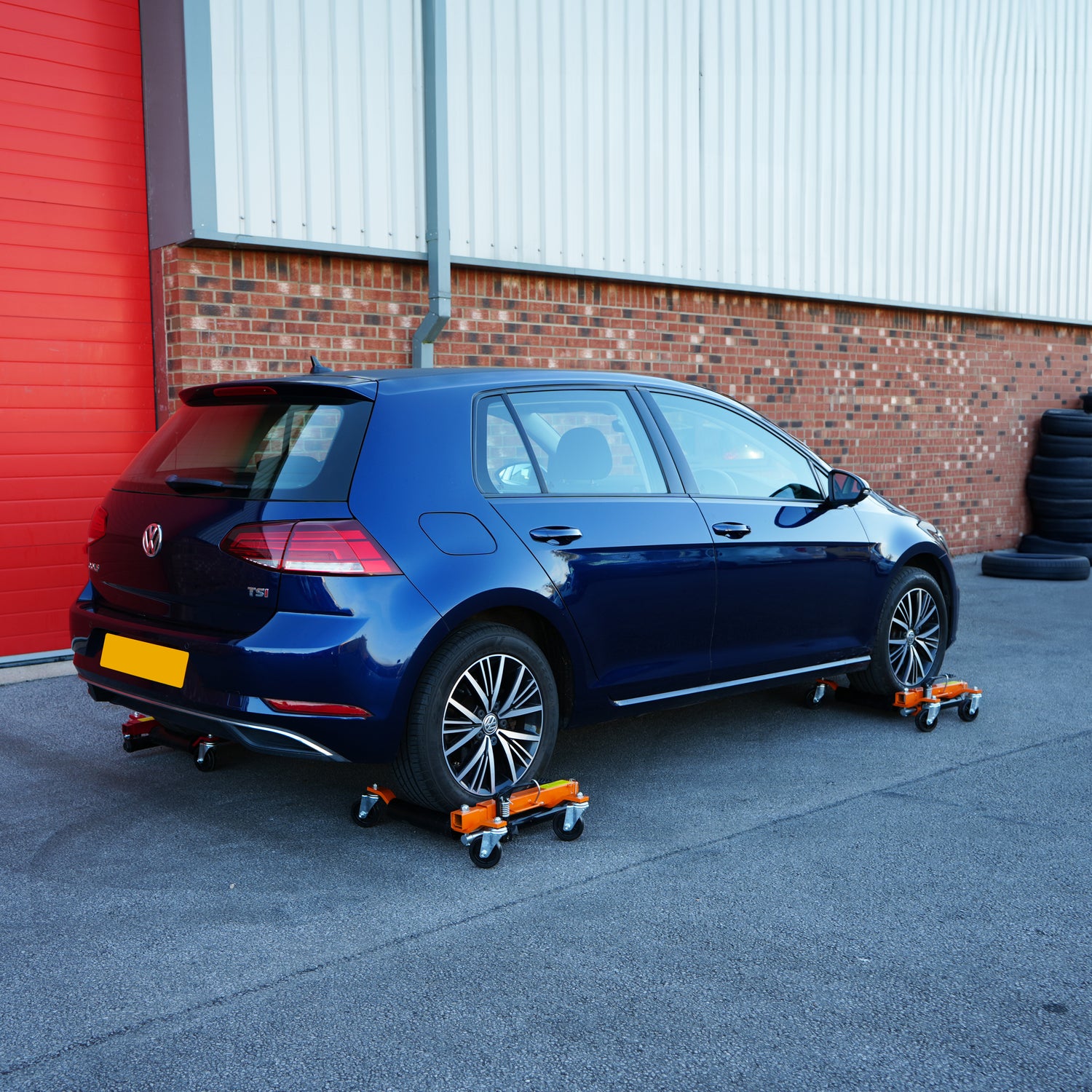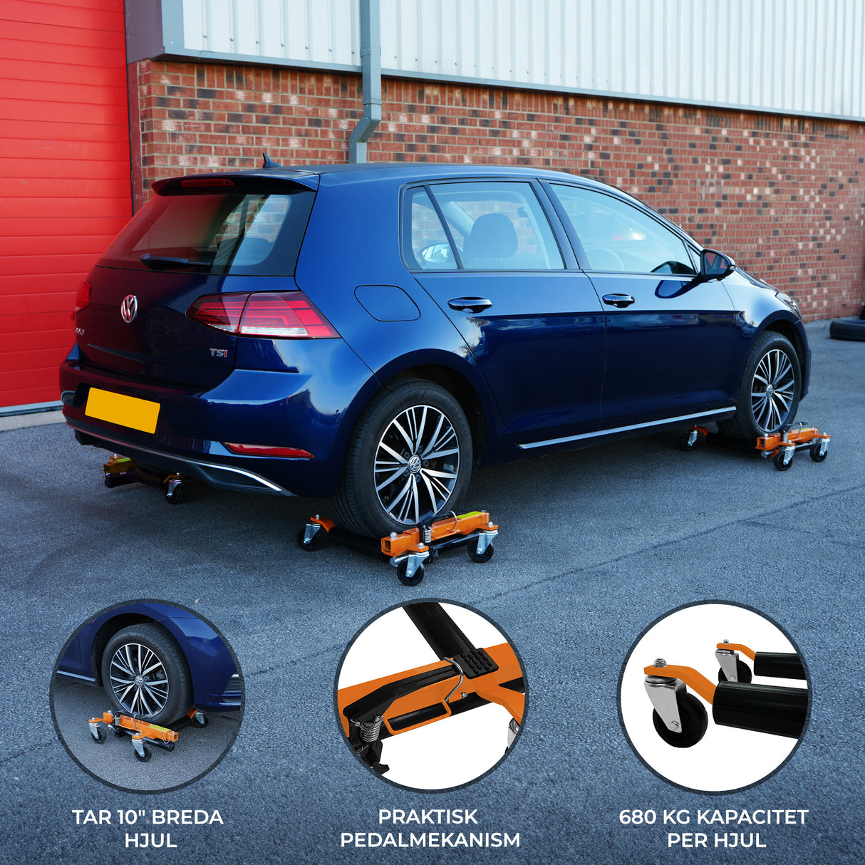 För ökad säkerhet är stålvagnarna utrustade med en säkerhetssprint i en kedja och en snabbfrigörande skruv som ser till att sänka lasten sker snabbt och smidigt. Med endast två vagnar kan du vrida ett fordon upp till 180 grader, och med fyra vagnar kan du uppnå en full rotation på 360 grader, vilket ger otrolig flexibilitet vid manövrering i trånga utrymmen.