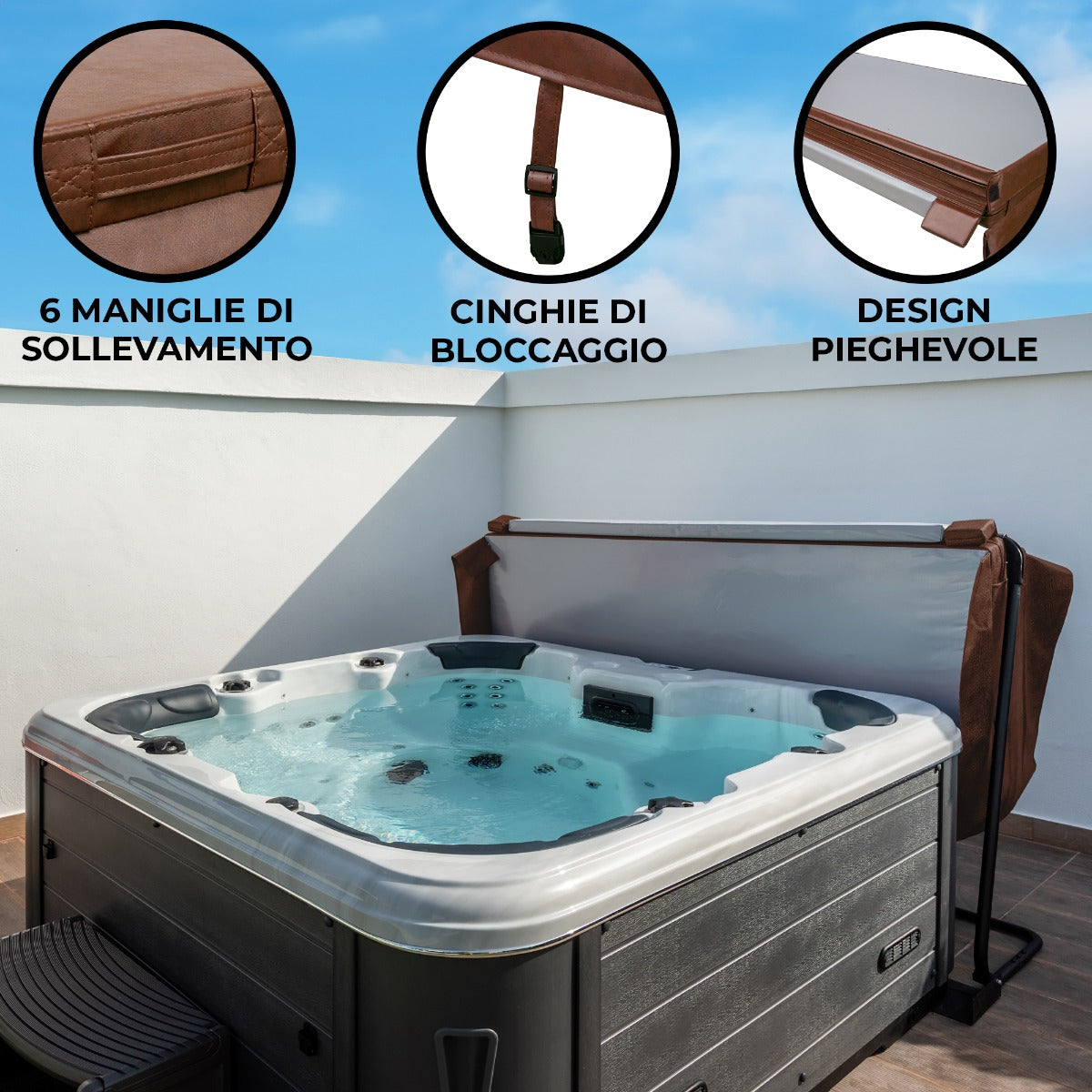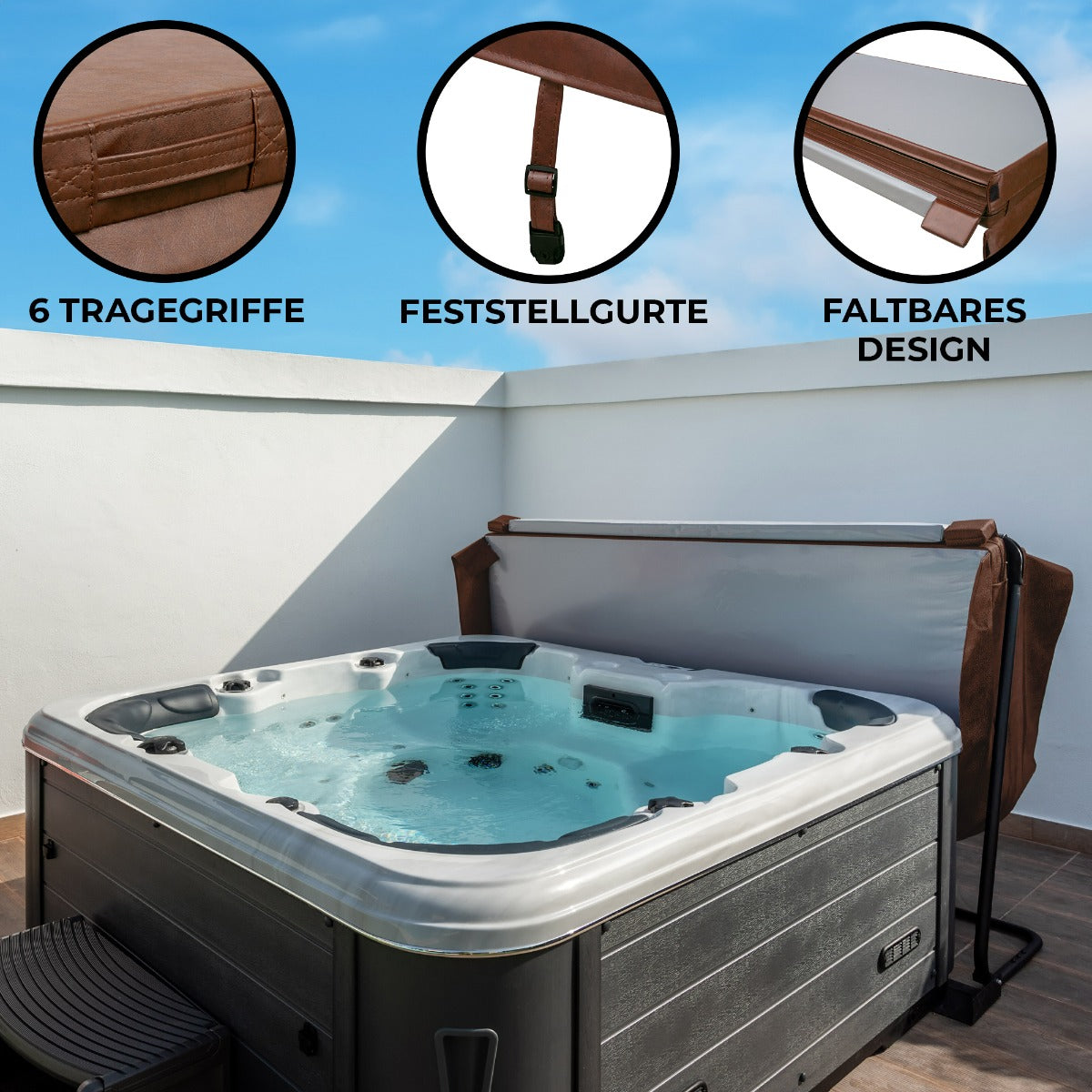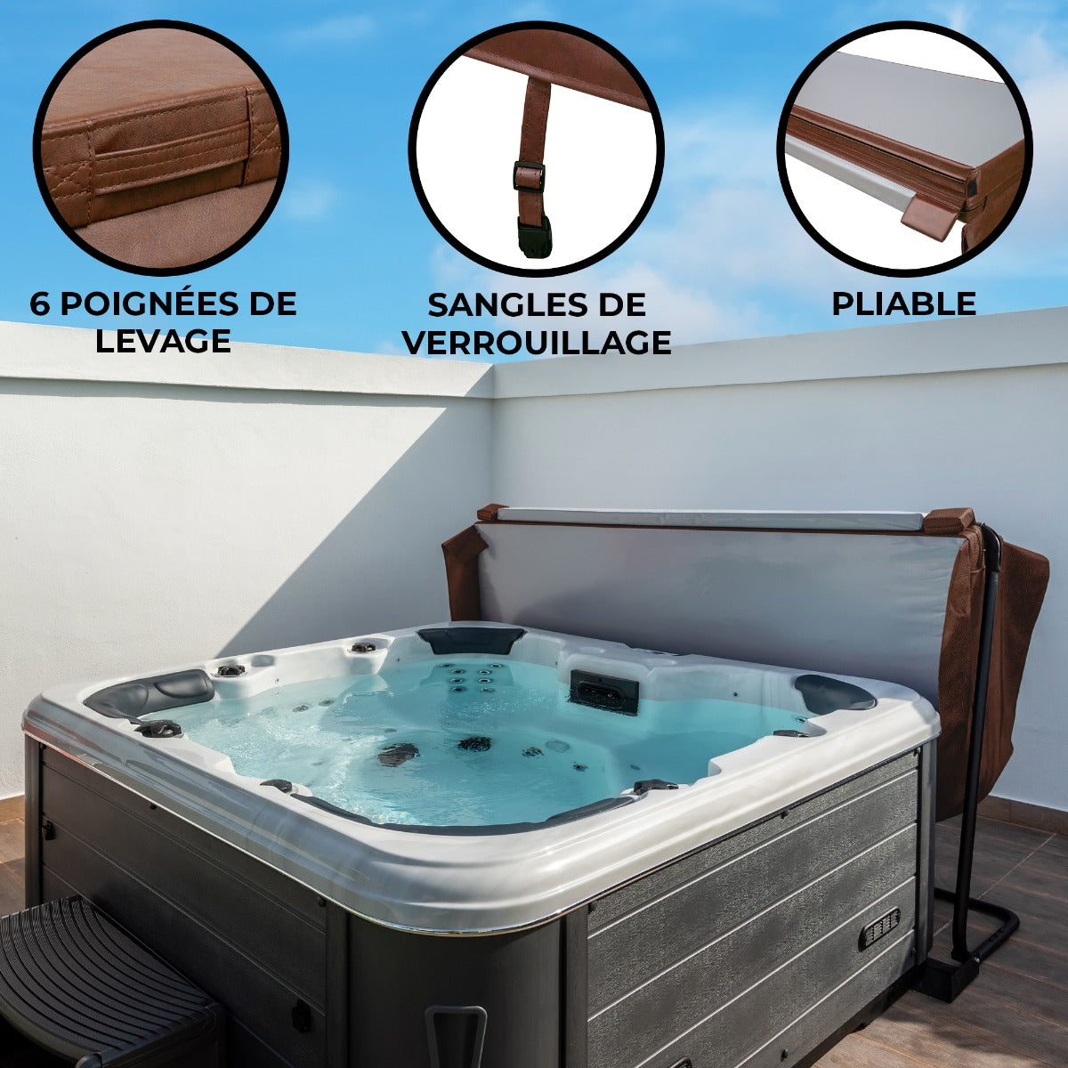Genom att kombinera funktionalitet, säkerhet och stil, lägger detta jacuzzilock till ett extra lager av bekvämlighet till din spaupplevelse. Med sin eleganta läderfinish kompletterar det utan ansträngning all utomhusinredning och lägger till en touch av elegans till ditt spaområde.