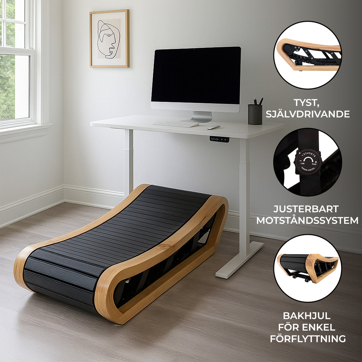 Speciellt utformat för att placeras under höj- och sänkbara skrivbord, passar den slanka designen perfekt under de flesta ståbord och skapar en kompakt men funktionell arbetsstation. Den kurvade strukturen främjar ett naturligare steg, och avsaknaden av handtag ger full rörelsefrihet. Löparbandet har ett justerbart växelsystem som låter dig reglera bandets motstånd och kontrollera takten efter dina önskemål – från lugn promenad till mer energiskt tempo.