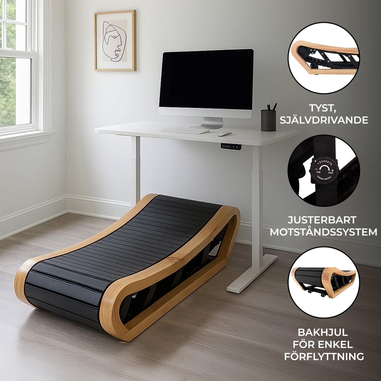 Detta löparband är motordrivet, vilket gör det extremt tyst och miljövänligt – perfekt för delade kontor eller hemmamiljöer där ljudnivå är viktigt. Integrerade hjul på baksidan gör det enkelt att flytta eller förvara bandet, och det levereras helt monterat, redo att användas direkt. Den robusta trästrukturen säkerställer inte bara hållbarhet, utan tillför även en varm och naturlig känsla till arbetsutrymmet.
