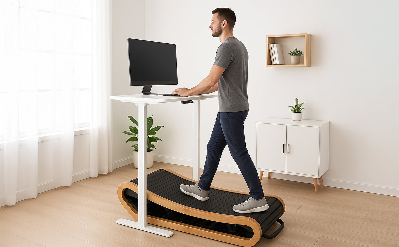 Designad för att kombinera produktivitet och rörelse, erbjuder detta eleganta kurviga löparband i trä ett smart och stilfullt sätt att hålla sig aktiv medan du arbetar.