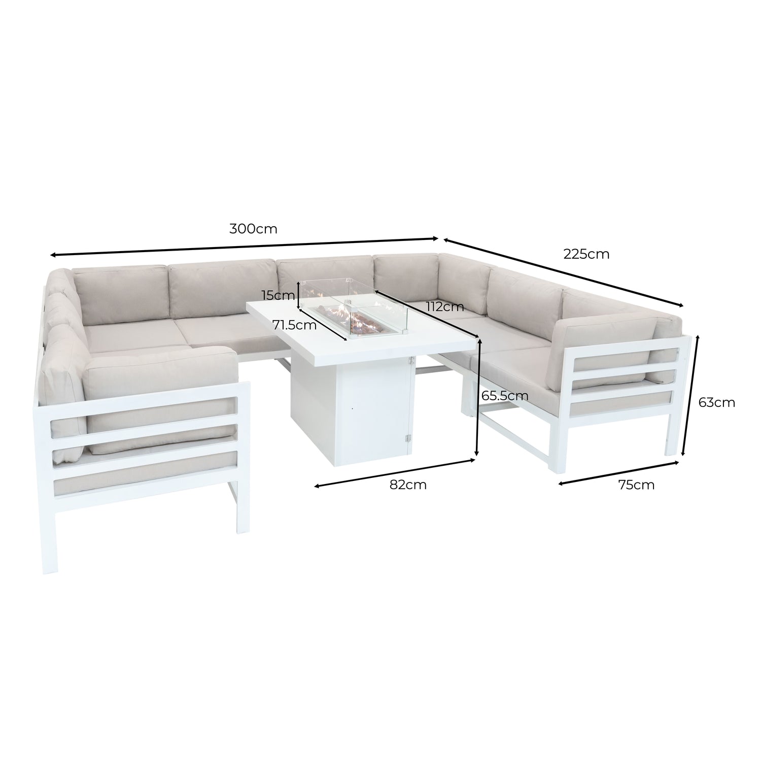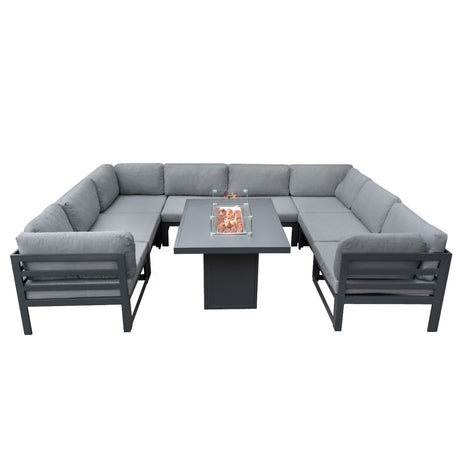 Förvandla din trädgård till en fristad av avkoppling och underhållning med denna noggrant utformade modulära trädgårdsmöbelgrupp och eldstad.