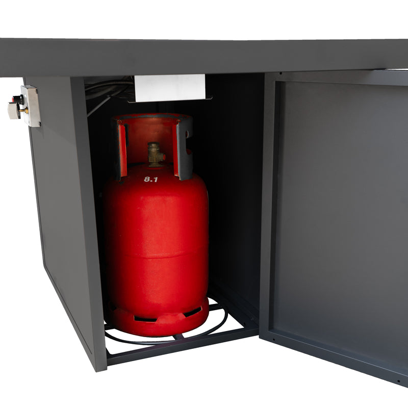 Den stora bordsskivan förser en generös yta för mat eller underhållning och skapar en mångsidig plats för gemensamma måltider eller utomhusevenemang. Dessutom döljer det smart designade bordet för eldstaden den nödvändiga gasflaskan inuti, vilket säkerställer en stilren och estetiskt tilltalande framtoning.