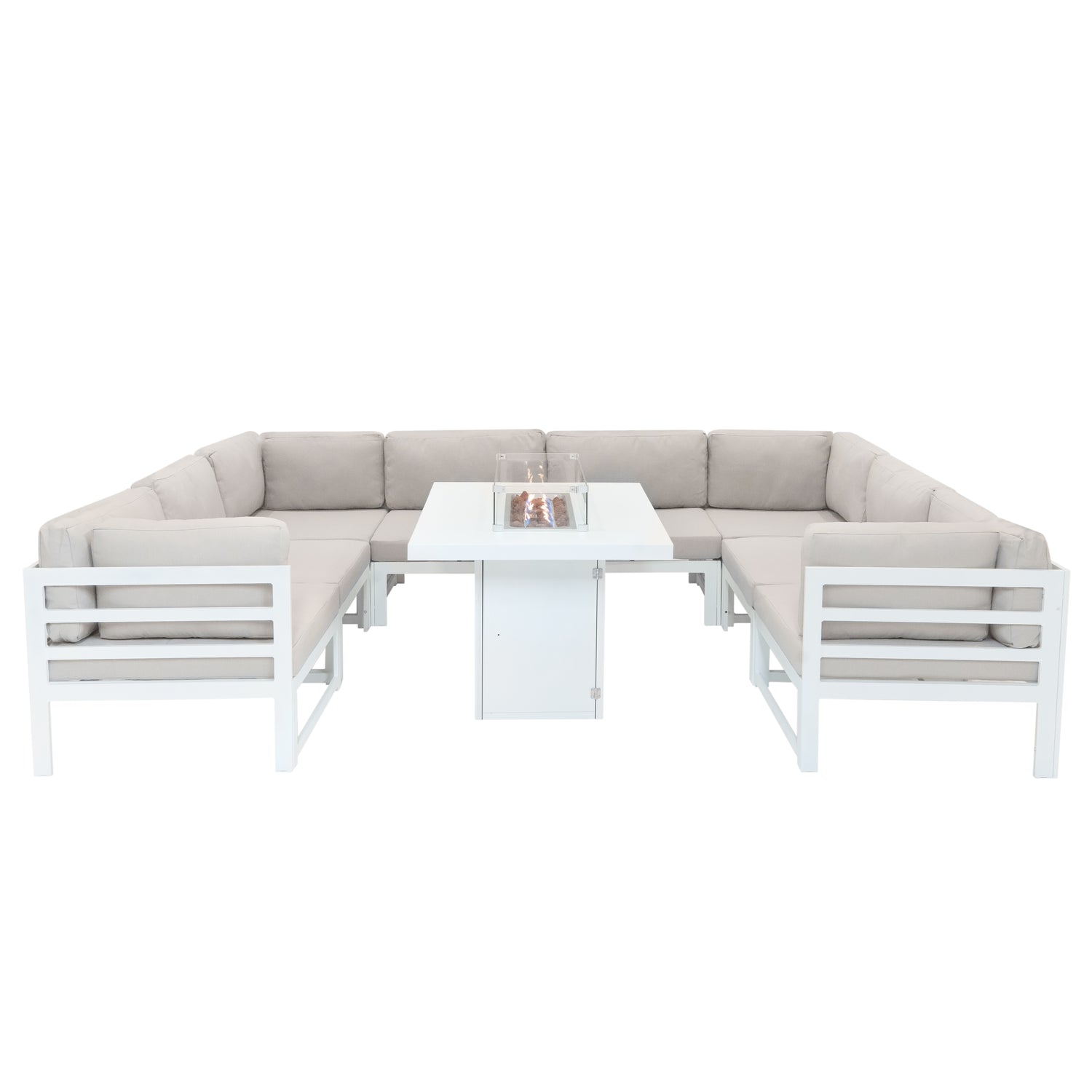 Tillverkat av Vit aluminium, skryter denna modulära möbelgrupp inte bara med varaktig hållbarhet utan utstrålar även tidlös estetik. Den modulära designen, med åtta rymliga sittplatser, möjliggör anpassningsbara arrangemang och gör den mångsidig för olika utomhusaktiviteter - vare sig det handlar om att arrangera livliga sammankomster eller skapa en intim personlig fristad.