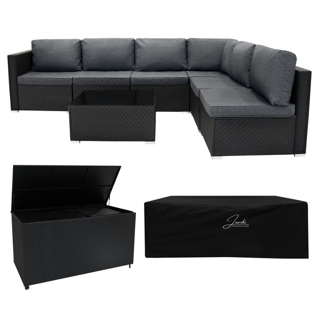 Omvandla din utomhusmiljö till en elegant och funktionell oas med detta moderna modulära rattanmöbelset i svart, som även inkluderar en förvaringslåda på 996L för att hålla ditt utrymme organiserat utan ansträngning.
