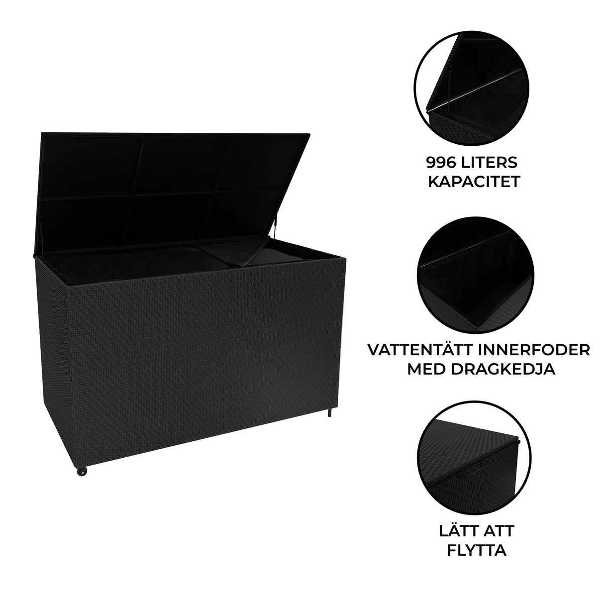 Med en kombination av stil, hållbarhet och funktionalitet är förvaringslåda på 996L en oumbärlig lösning för alla ute- eller inomhusutrymmen. Perfekt för att organisera din trädgård, hålla din uteplats fri från röra eller lyfta din utomhusmiljö med en sofistikerad touch.