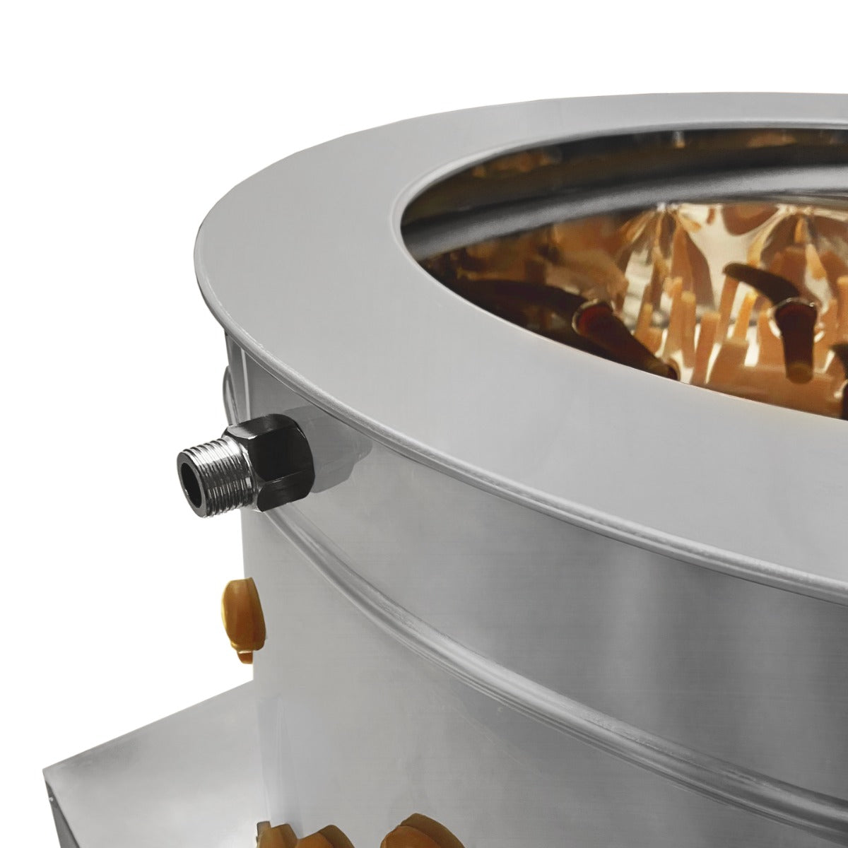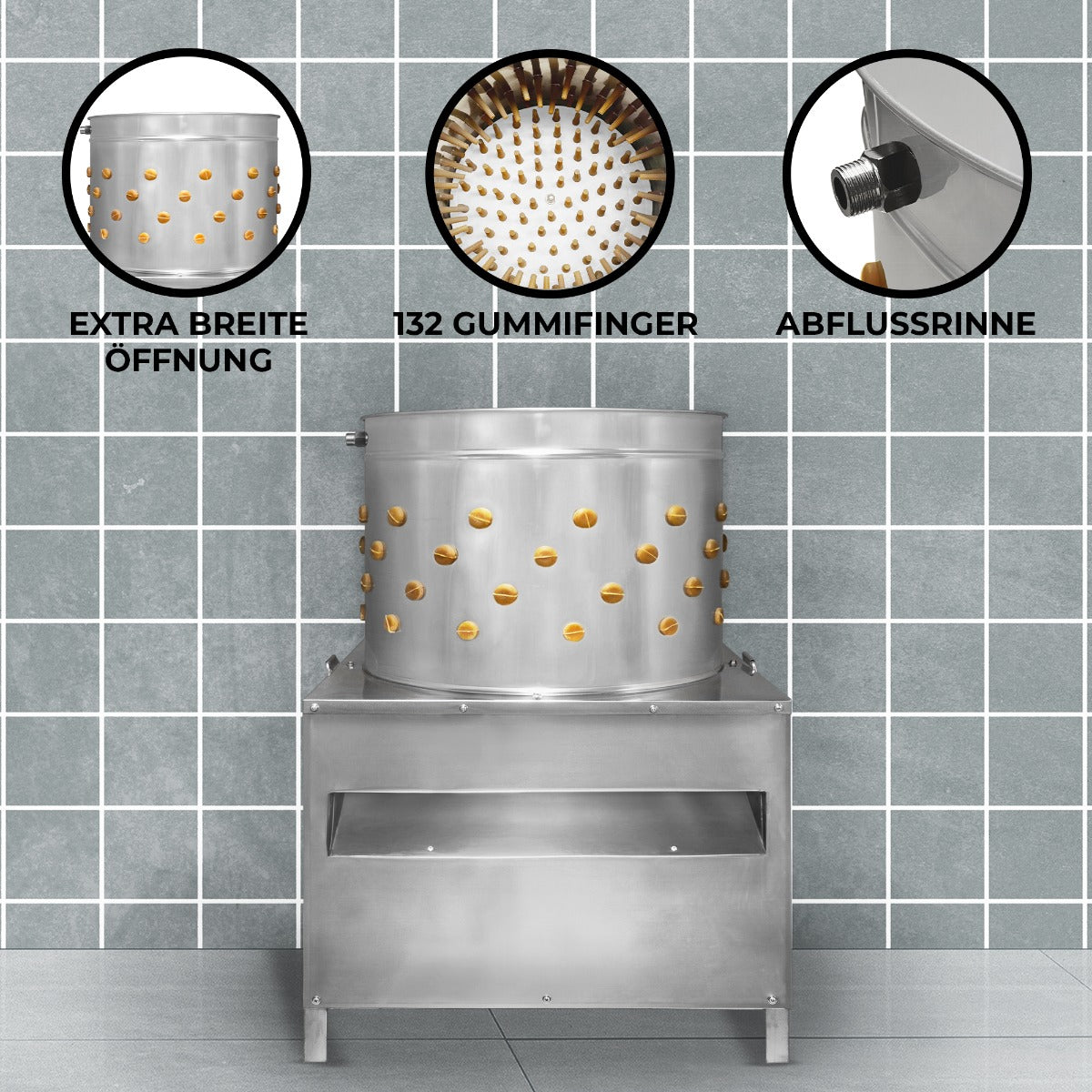 Maskinen är tillverkad av slitstarkt rostfritt stål, är extremt robust och byggd för att tåla frekvent användning. Fodrad med 132 förmonterade flexibla gummifingrar, dessa tar snabbt och effektivt bort fjädrar genom att gnuggas mot fjäderfän. Basen på trumman är försedd med en snurrande skiva som flyttar fåglarna runt maskinen för att säkerställa att alla delar av fågeln kommer i kontakt med fingrarna för en fullständig avlägsning av fjädrarna.