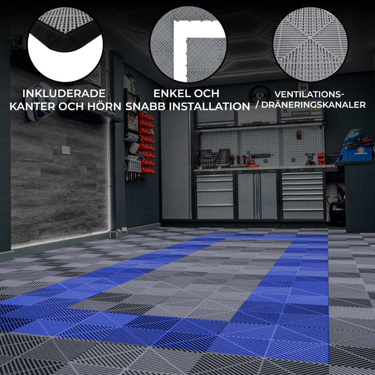 Det är inte bara ett skyddande golv utan även en estetisk förbättring av ditt utrymme. De stiliga grå och blå plattorna ger en ren och modern estetik som höjer vilket garage eller verkstad som helst, och gör det till en plats du kommer vara stolt över att visa upp eller njuta av att tillbringa tid i. Underhållet är enkelt – du behöver bara sopa eller spola av plattorna vid behov för att hålla dem som nya.
