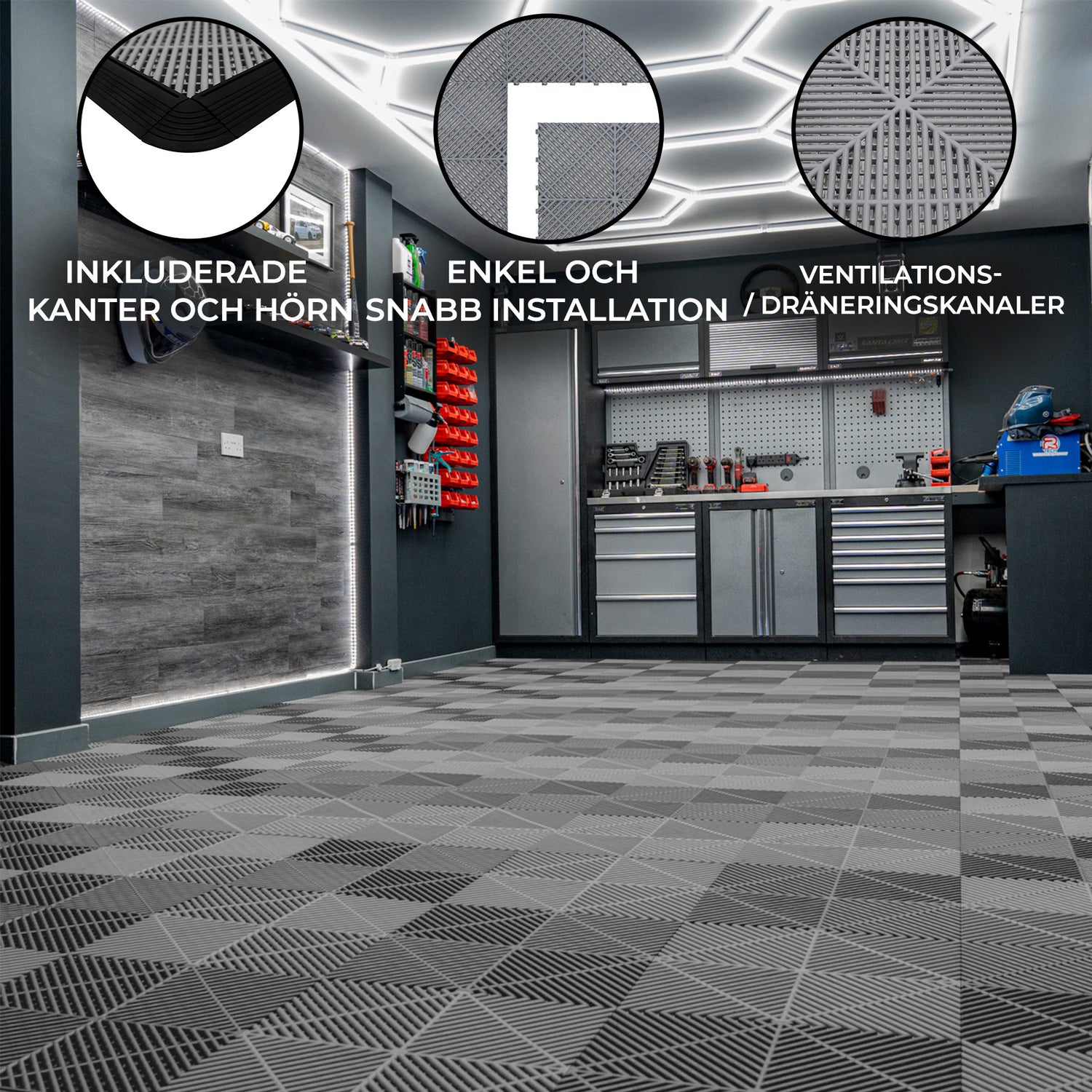 Det är inte bara ett skyddande golv utan även en estetisk förbättring av ditt utrymme. De stiliga Grå plattorna ger en ren och modern estetik som höjer vilket garage eller verkstad som helst, och gör det till en plats du kommer vara stolt över att visa upp eller njuta av att tillbringa tid i. Underhållet är enkelt – du behöver bara sopa eller spola av plattorna vid behov för att hålla dem som nya.