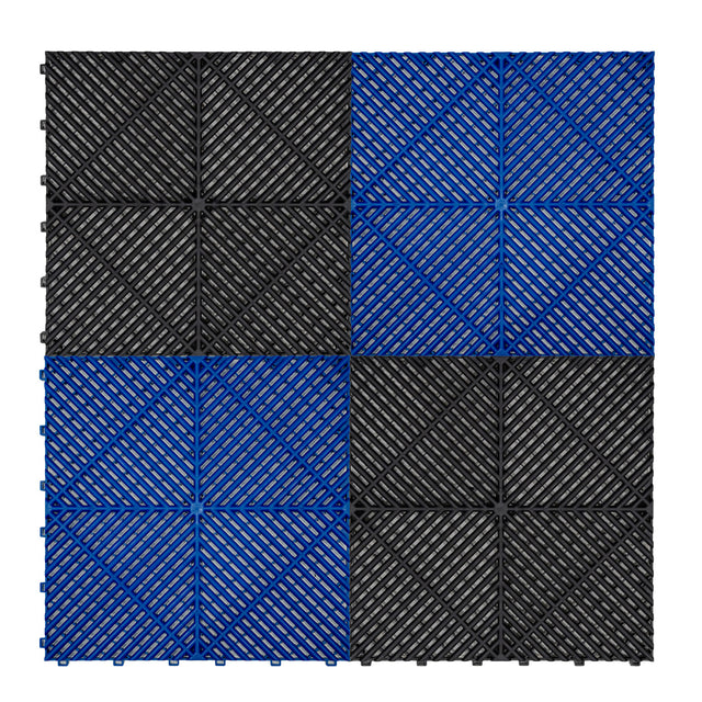 Det är inte bara ett skyddande golv utan även en estetisk förbättring av ditt utrymme. De stiliga svarta och blå plattorna ger en ren och modern estetik som höjer vilket garage eller verkstad som helst, och gör det till en plats du kommer vara stolt över att visa upp eller njuta av att tillbringa tid i. Underhållet är enkelt – du behöver bara sopa eller spola av plattorna vid behov för att hålla dem som nya.