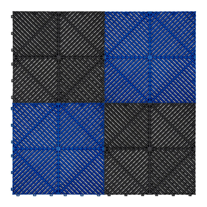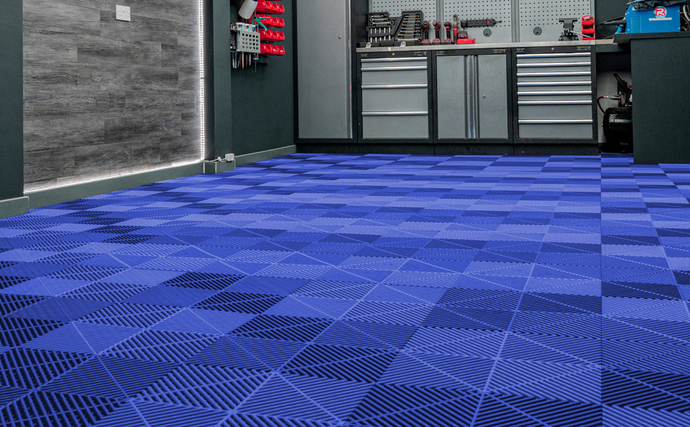 - 4 lådor med 30 ventilerade garageplattor i blå.