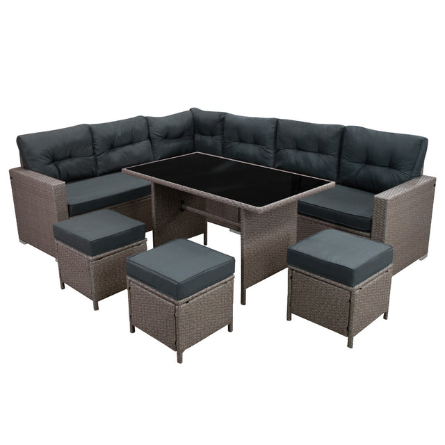 Designade för maximal stil och komfort, dessa utsökta möbelgrupper består av en hörnsoffa, 3 x pallar och ett bord i glas. Dessa set har plats för nio personer och kommer säkerligen att vara den perfekta mittpunkten för alla trädgårdsfester eller middagar utomhus.