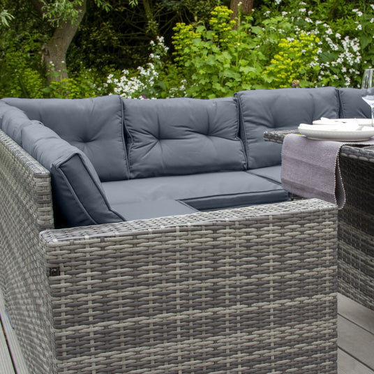 Möblerna har en slående grå finish med extra tjocka vackra grå kuddar, vilket förser en modern och lyxig touch till din trädgård. Med tillägget av ett skyddande UV-lager kan du vara säker på att dina möbler kommer att skyddas från väder och vind året runt vilket hjälper möblerna att behålla sin vackra färg.