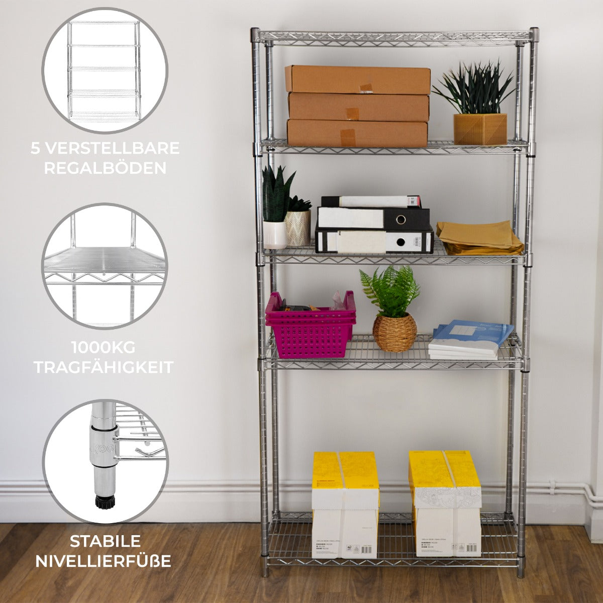 Med sin enorma viktkapacitet, hållbara struktur och övergripande funktionella design är denna trådhyllsektion med 5 hyllplan den perfekta lösningen för dina förvaringsbehov.