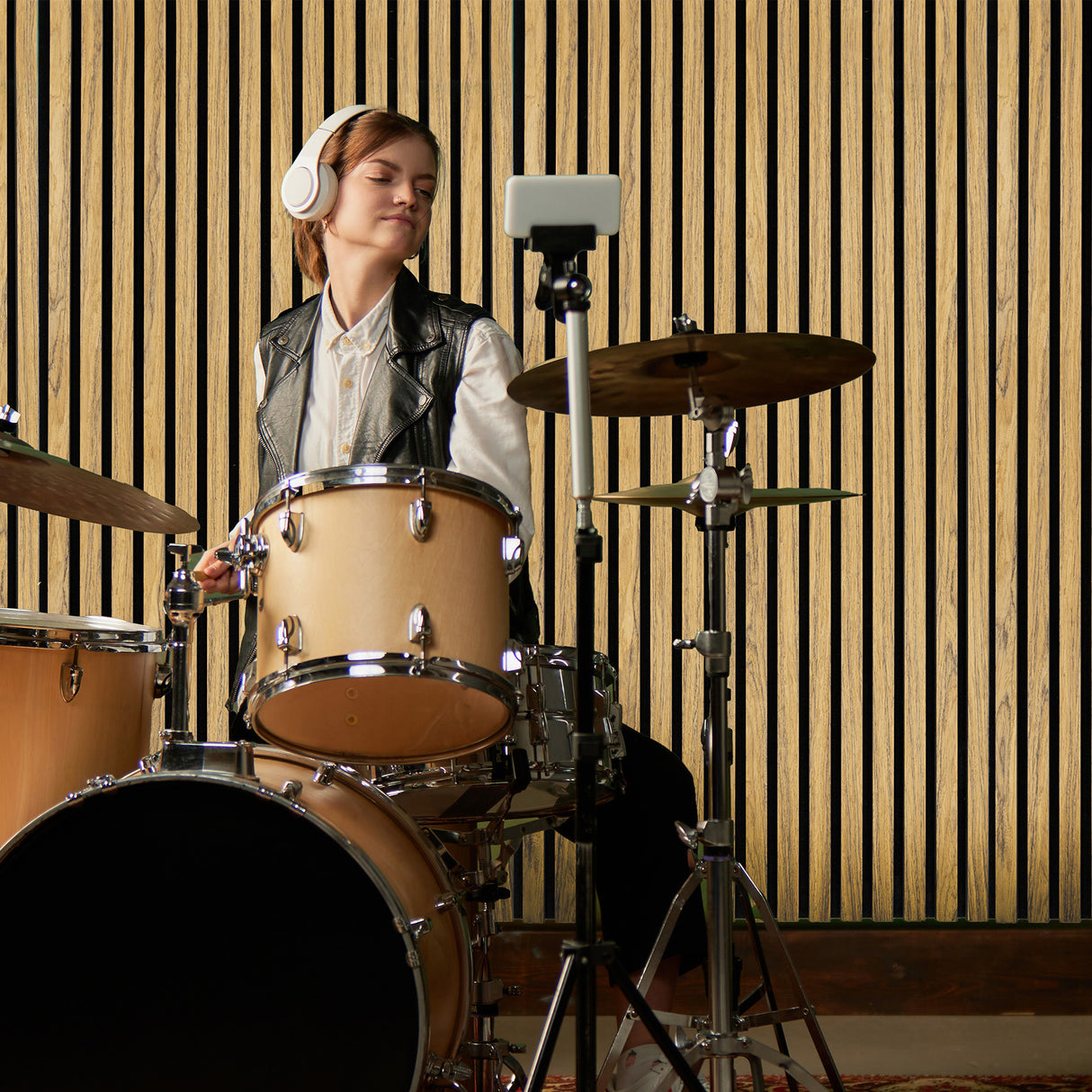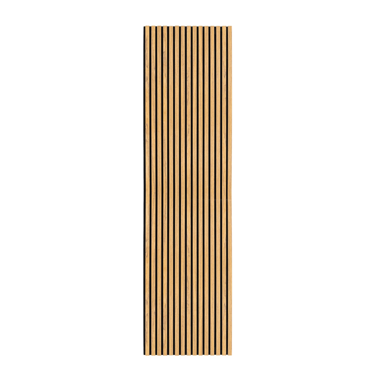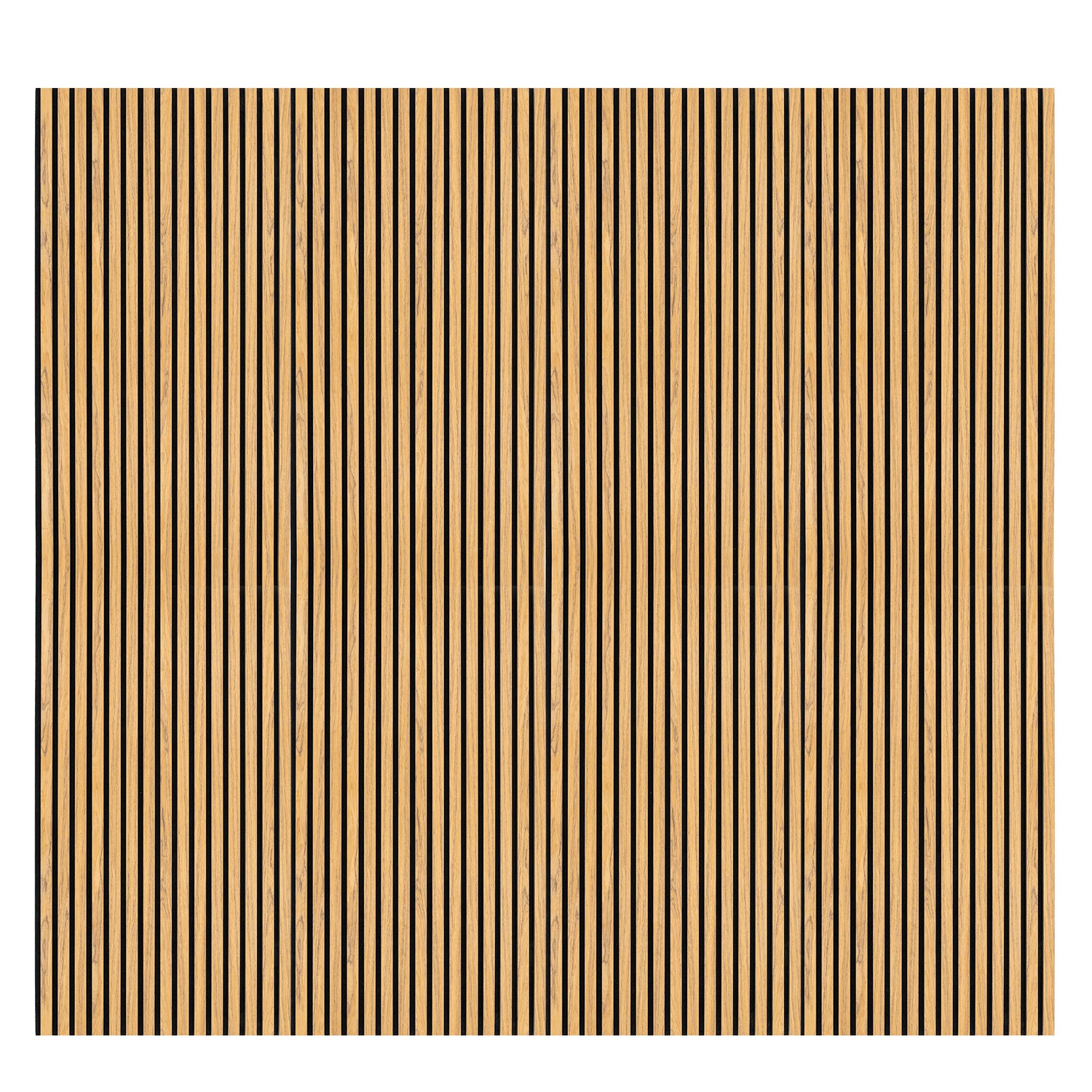 Tillverkade med precision, är ribborna gjorda av slitstarkt MDF med en fanerad träfinish, vilket ger den varma och tidlösa känslan av naturlig ek. Varje ribba är monterad på en 9 mm tjock filtbas, som effektivt dämpar ljud samtidigt som den är brandsäker för extra säkerhet. Ribborna är 27 mm breda och 12 mm tjocka, med ett mellanrum på 13 mm, vilket skapar ett modernt och stilrent mönster som kompletterar alla typer av inredning. De noggrant utvalda materialen garanterar både en visuellt tilltalande design och långvarig prestanda.