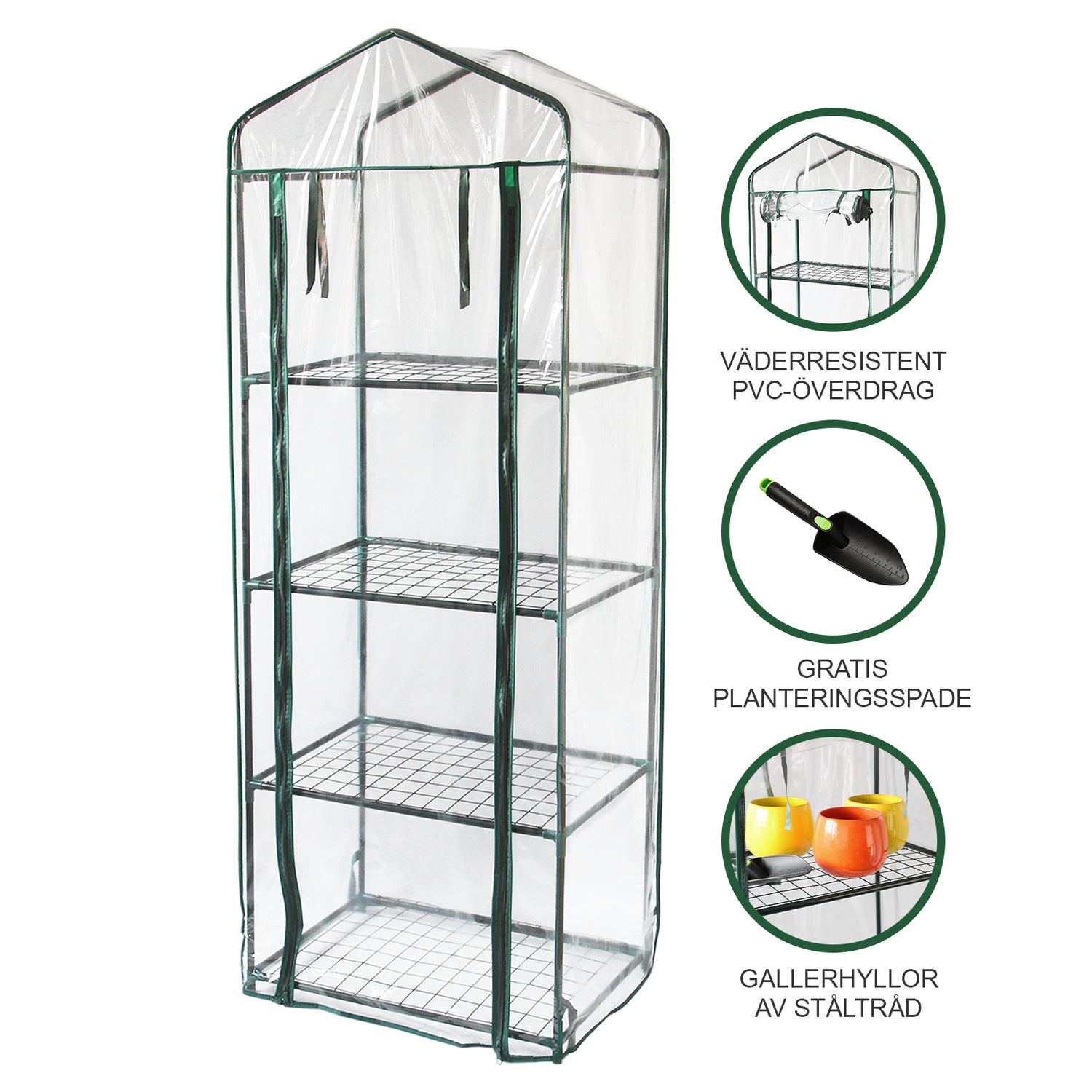 - Ett robust växthus med 4 hyllplan och PVC-överdrag