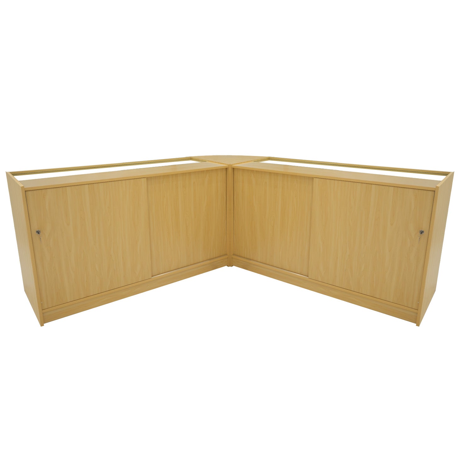 Den eleganta, böjda formen passar perfekt i hörn eller som övergång mellan två raka diskar. Trots det kompakta formatet erbjuder den dold förvaring genom invändiga hyllor (åtkomliga från baksidan när modulen används fristående eller placeras i slutet av en konfiguration) – praktisk förvaring utan att kompromissa med den minimalistiska och stilrena estetiken. En idealisk lösning för att maximera butikens yta samtidigt som den visuella harmonin bibehålls.